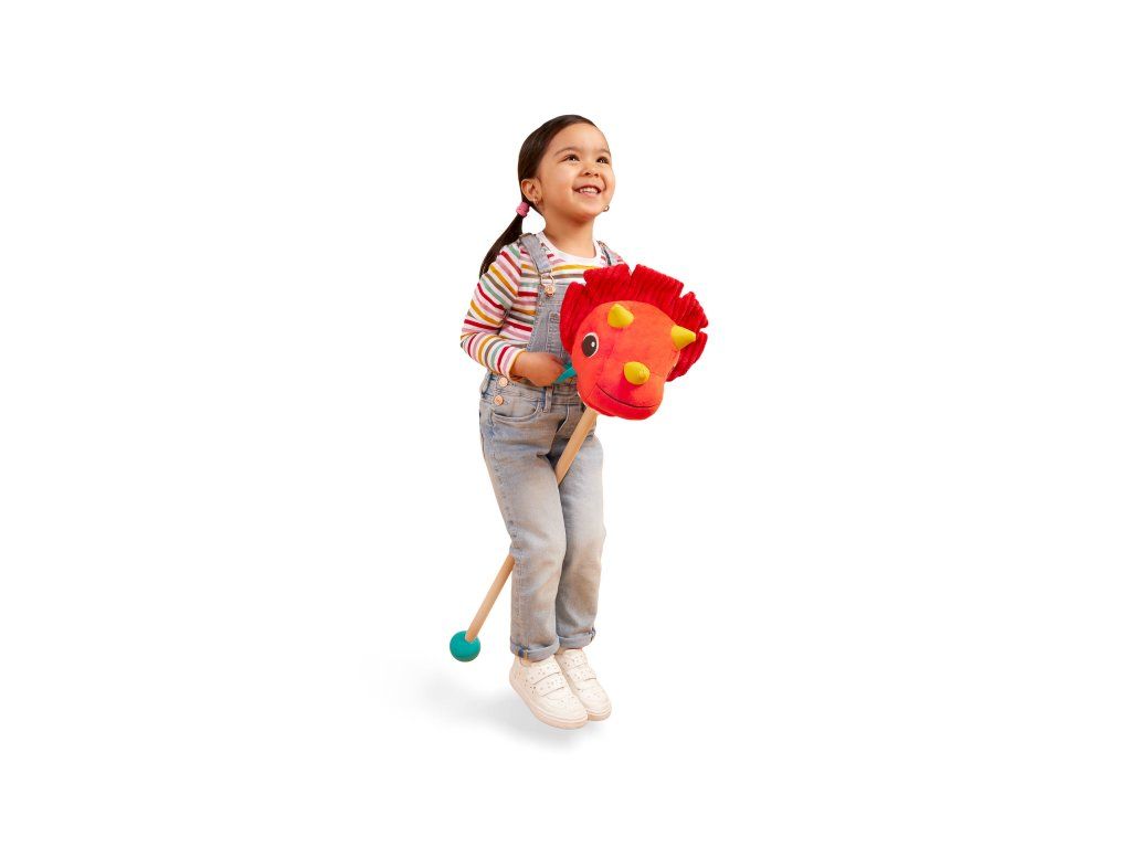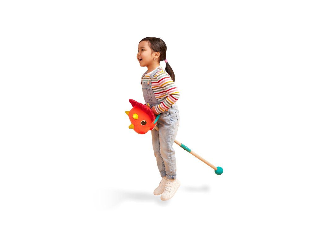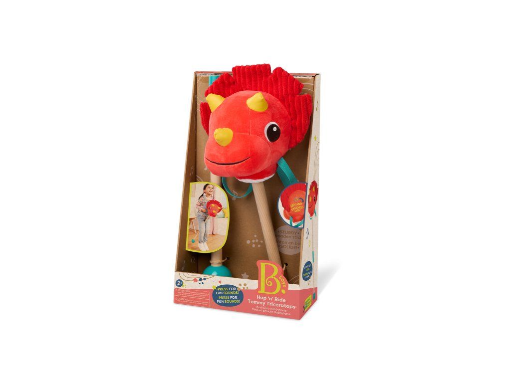 Připravte se na jízdu do pravěkého světa s rozkošným Tommy Triceratopsem od B. Toys! Tento plyšový dinosaurus na tyči je originální verzí klasické hračky "koníka na tyči" a zaručí dětem spoustu aktivní zábavy. Hebká hlava z různých senzorických materiálů stimuluje hmat, stisknutím tlačítka se navíc ozvou veselé dinosauří zvuky. Děti si mohou nasednout, pevně chytit otěže a rozběhnout se za dobrodružstvím. Díky pogumované spodní části nenechá tyč škrábance na podlaze.