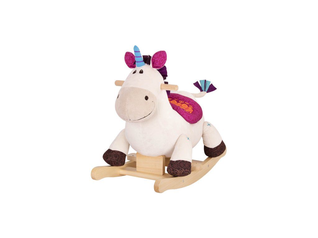 Rozkošný plyšový houpací jednorožec s dřevěnou základnou a držadly. Během houpání se ozývá klapot kopyt.