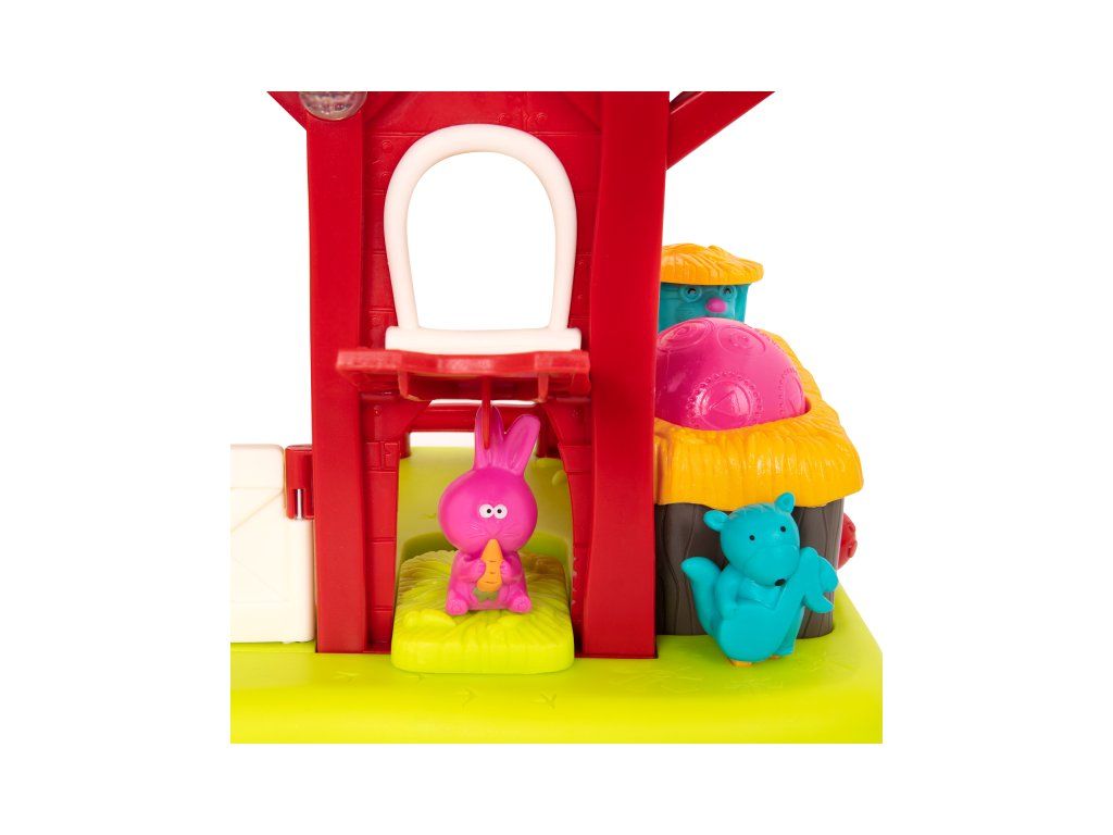 Interaktivní farma se zvířátky je tu, aby vašemu dítěti přinesla hodiny a hodiny nápadité hry! Farma nabízí množství různých překvapivých aktivit, které budou děti postupně objevovat. Otevřete dvířka stodoly, rozsvítí se světýlka! Postavením kravičky, prasátka, ovečky nebo koníka dovnitř stodoly spustíte jednu ze čtyř melodií se zvuky jednotlivých obyvatel farmy. Vložte do otvoru ve střeše sila vedle stodoly kuličku a sledujte, jak běží dráhou dolů, až vyskočí spodními dvířky. Posouvejte myšku nad dveřmi stodoly a slepička na půdě začne skákat a kdákat. Stisknutím veverky aktivujete hudební mišmaš. Otevřete dvířka a objeví se zajíček. Vložte kuličku do hromádky sena a nakoukne na vás krtek. Netopýr na střeše se otáčí.