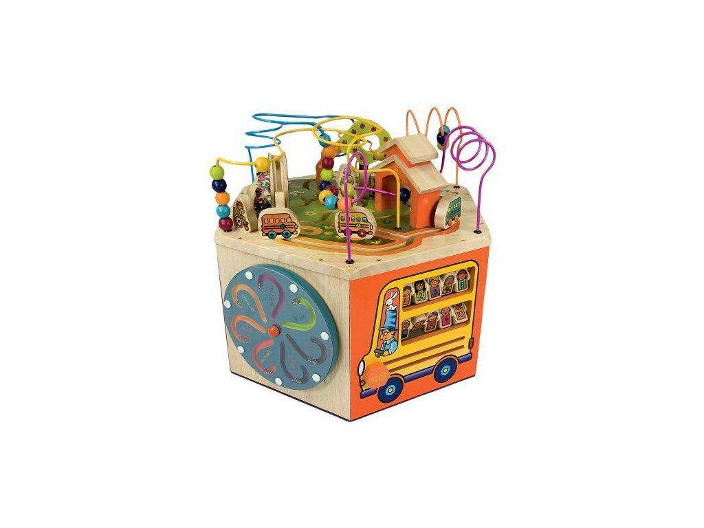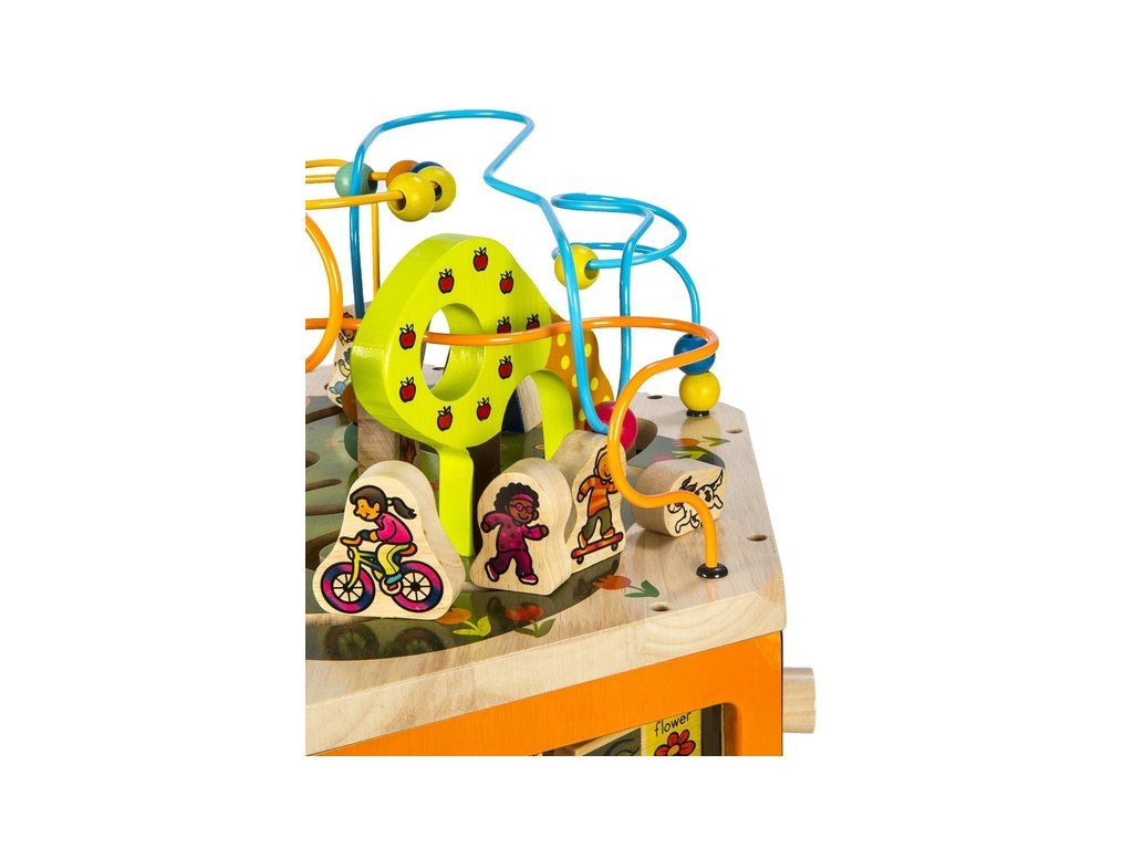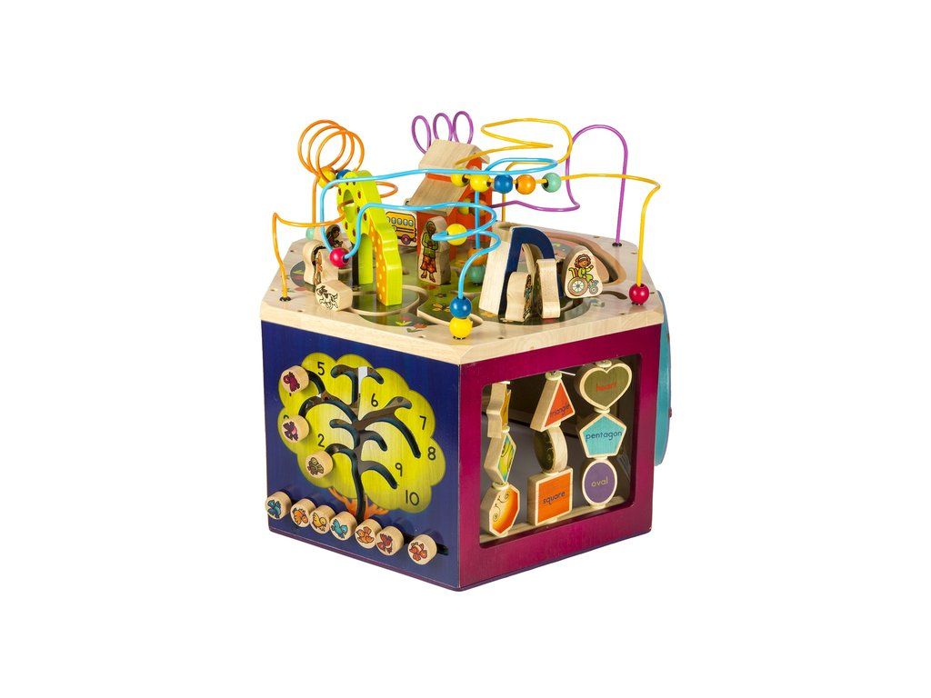 Unikátní dřevěné hrací centrum s mnoha pohyblivými a rozmanitými aktivitami zajistí vašemu dítěti hodiny zábavy. Díky své velikosti zabaví současně i několik dětí. Každá ze sedmi stran hracího centra nabízí jiný typ aktivity. Pomůže dětem naučit se barvy, tvary, čísla, písmenka i první anglická slovíčka. Vyrobeno z vysoce kvalitního dřeva s krásnou povrchovou úpravou. Rozměry: 61 × 61 × 53,3 cm. Vhodné pro děti od 1 do 3 let.