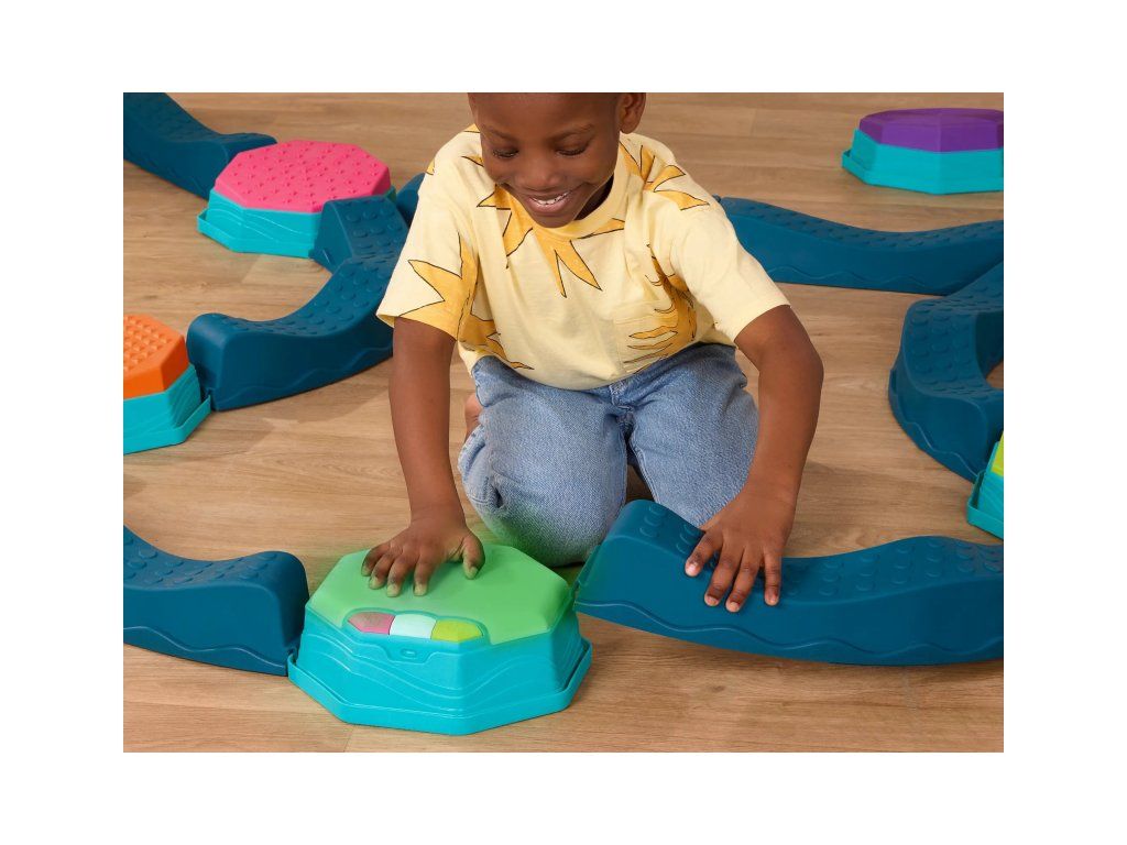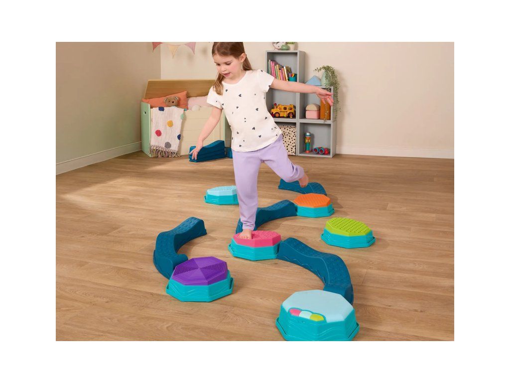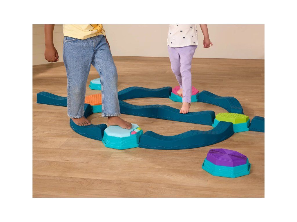 Variabilní překážková dráha Rovnováhy a Rytmu poskytne vašim dětem zábavu a zároveň pomáhá rozvíjet jejich rovnováhu, koordinaci a hrubou motoriku. Součástí sady je speciální hudební stupínek s LED světelnými efekty, který dodává celé dráze magický efekt a motivuje děti zkoušet další a další herní varianty. Sada nabízí mnoho kombinací a způsobů použití, takže pokaždé můžete vymyslet novou, zajímavou variantu. Každý kulatý stupínek navíc nabízí jinou texturu na horní barevné straně.