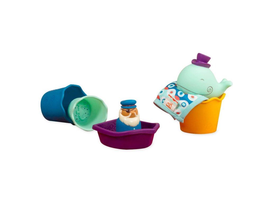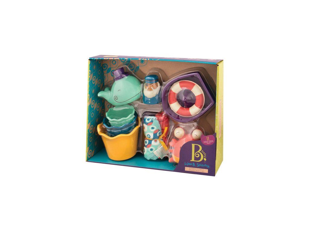 11dílná sada obsahuje dvě stříkací hračky v podobě velryby a jejího kamaráda z moře, člun, kruh, postavu kapitána, tři kelímky s otvory a 3 textilní žínky.