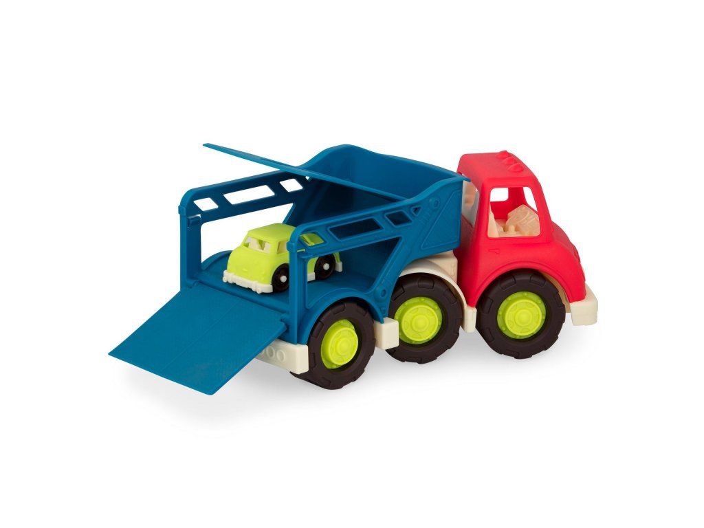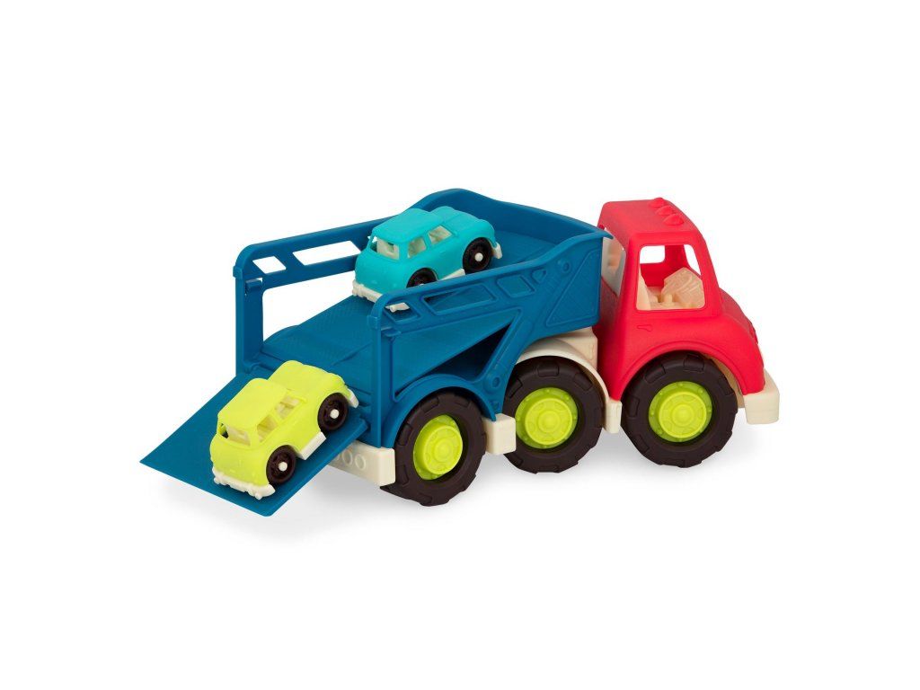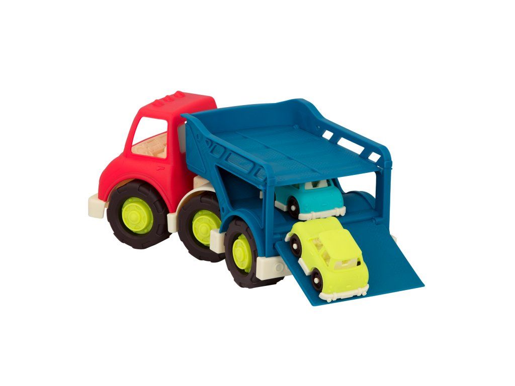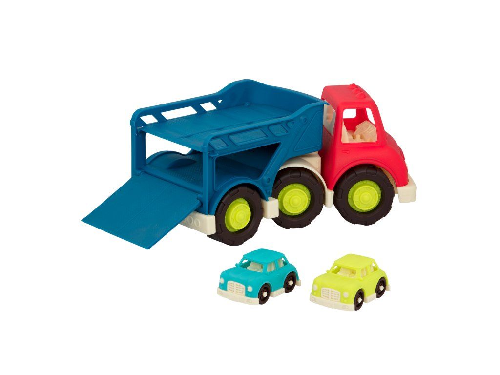 Robustní přepravník aut nabízí dvě patra pro převážení autíček. Zadní dveře se snadno přemění na nájezdovou rampu, po které autíčka na přepravník najíždějí.