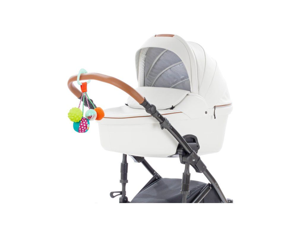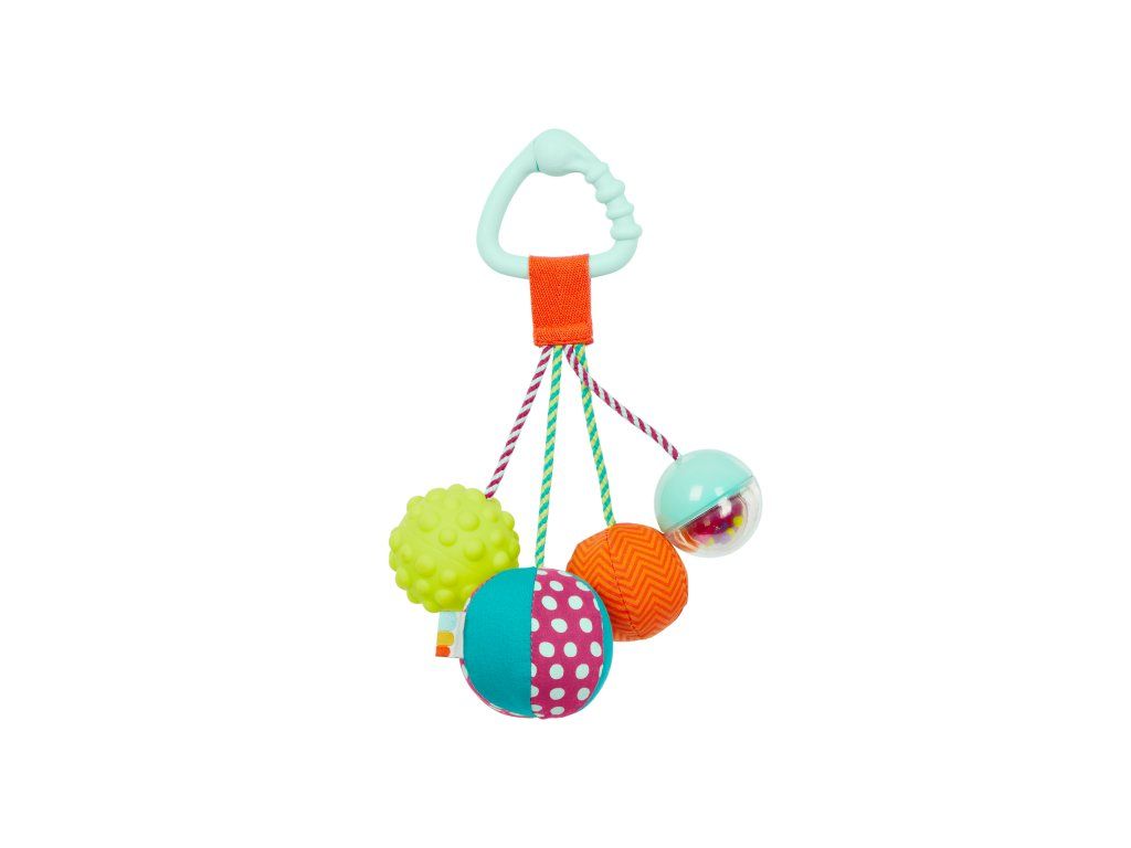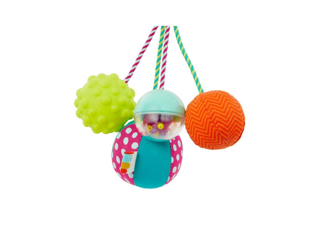 Závěsná chrastítko s míčky ve výrazných kontrastních barvách nabízí různorodé textury i zvuky - jednotlivé míčky cinkají, chrastí, pískají i šustí. Závěsný kroužek slouží i jako kousátko.