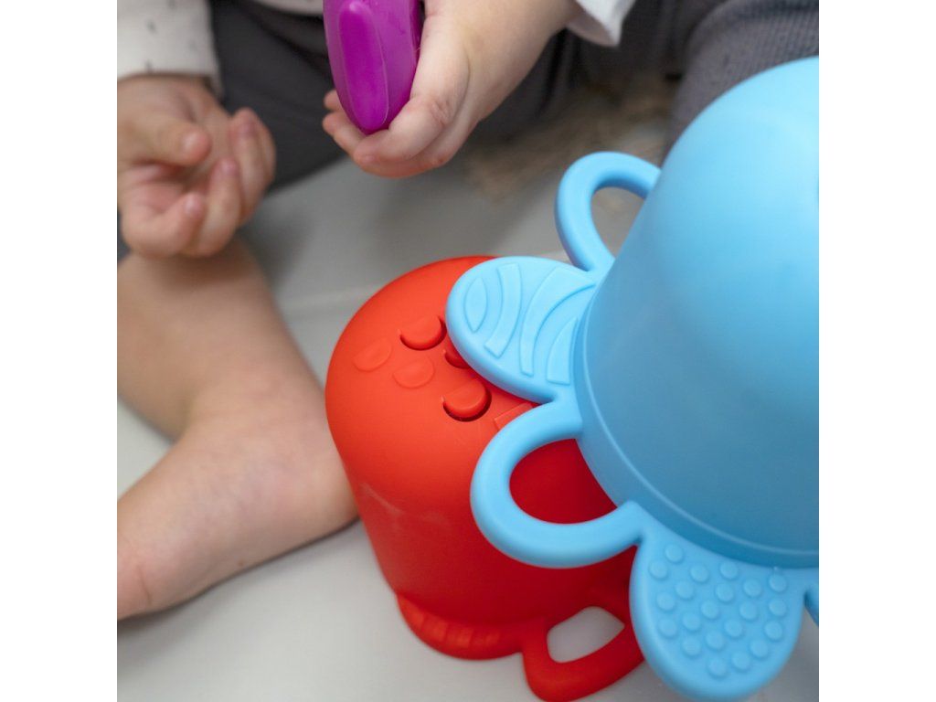 - kalíšky v zářivých barvách podporují učení barev a vizuální stimulaci, jakož i textury pro vícerozsmyslové zkoumání