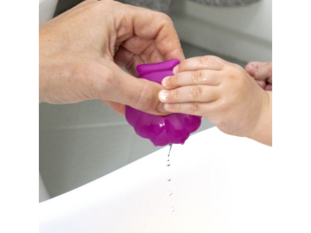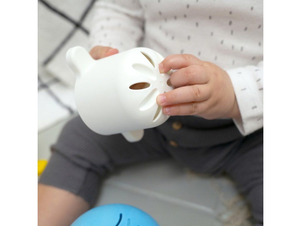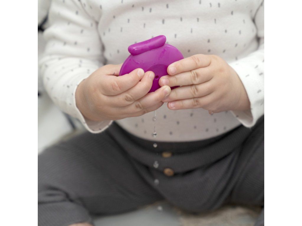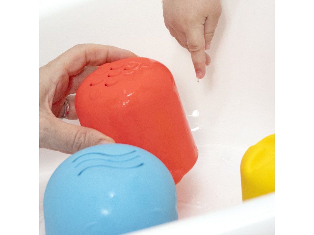 - multisenzorická hra se 4 velkými hnízdícími pohárky a stříkačkou na vodu ve tvaru mušle, které pomáhají dítěti stavět, nalévat a objevovat barvy, textury a další.