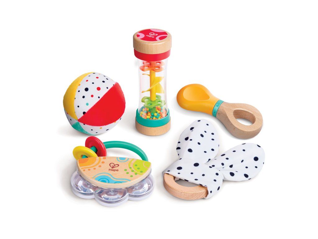 Senzorická sada hraček Hape 5 v 1. Tato sada stimuluje zrakové, sluchové a hmatové smysly díky zářivým barvám, rozmanitým texturám a poutavým zvukům. Tato fantastická sada obsahuje tamburínu, chrastítko, látkový míček, úchopový kroužek a dešťovou tyč, vše v jedné sadě, která nabízí komplexní zážitek pro vývoj miminek. Navrženo pro rozvoj vizuálních, sluchových, hmatových a úchopových dovedností, které pomáhají dětem učit se a růst při hraní. Rozměry balení: 24 x 30 x 8,8 cm. Doporučený věk: 0-18 měsíců.