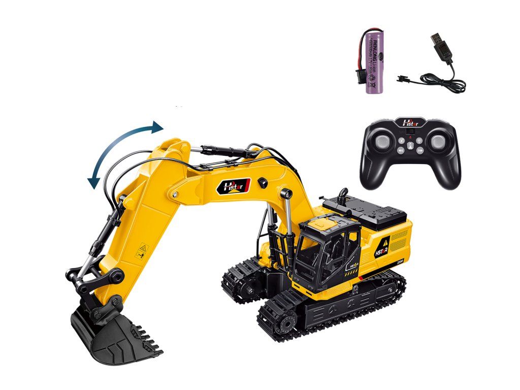 RC bagr na dálkové ovládání. Realistický model se zvukovými efekty a funkčním nabíráním ramenem. Frekvence 2,4 GHz. Ovladač nabízí jízdu vpřed/vzad, otáčení vlevo/vpravo, zvukové efekty s možností vypnutí, tlačítko DEMO, ovládání zvedání a pokládání ramene. Věž bagru je možné otáčet manuálně. Součástí je bateriový článek 3,7 V a USB kabel, ovladač funguje na 2x AA baterie (nejsou součástí). Rozměry bagru: 46 x 13 x 23 cm. Rozměry balení: 48,5 x 26 x 19,3 cm. Nevhodné pro děti do 3 let. Věk: 6+