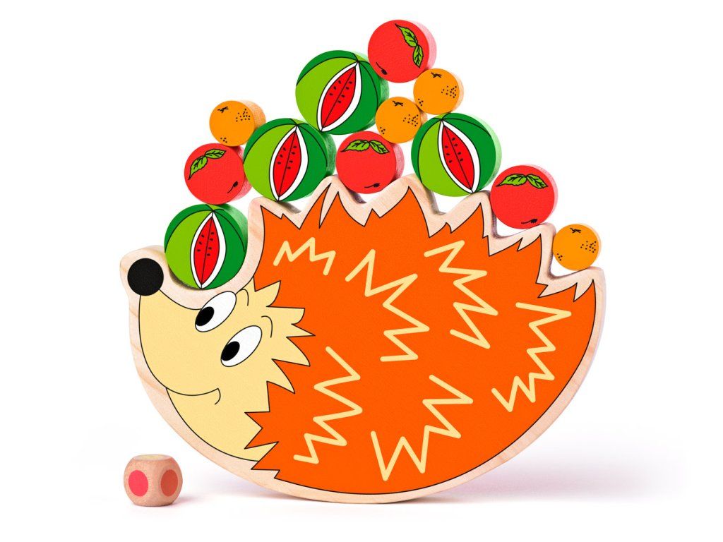 Hra a didaktická pomůcka v jednom. Hráči hází kostkou, na jejíchž stranách jsou barevné tečky. Barva tečky hráči napoví, které ovoce bude na ježka pokládat. Úkolem hráče je položit na ježka ovoce tak, aby se ježek nepřevážil a ovoce ze svého hřbetu nevysypal. | Věk: 3+ | Rozměr: 17 x 11 cm