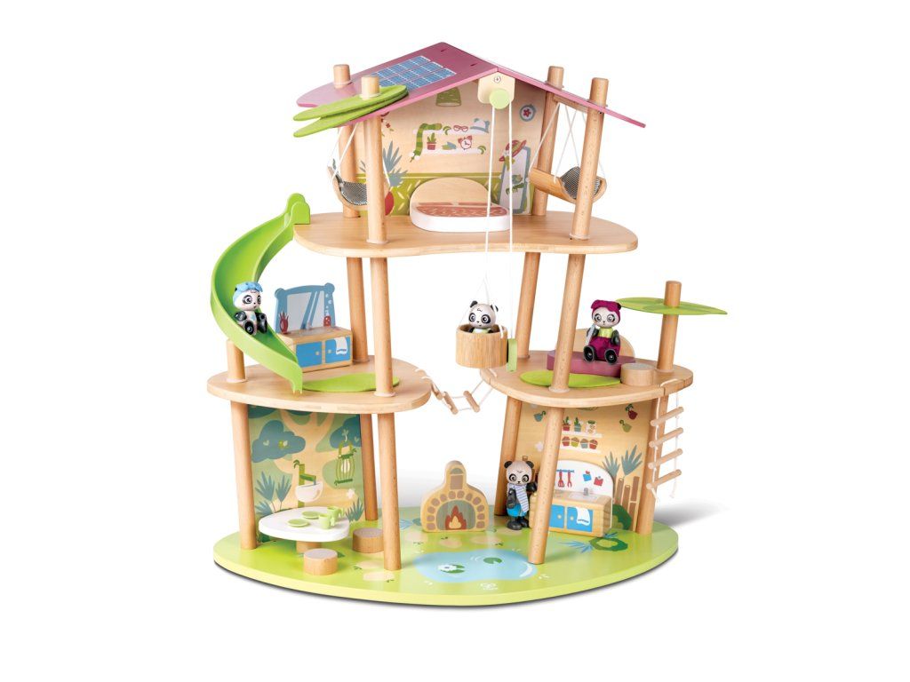 Bambusový domeček pro pandy. Tato sada z kolekce Green Planet Explorers je vyrobena z udržitelného bambusu a nabízí mnoho herních prvků - najdete v ní krb, houpací sítě, provazový žebřík a dokonce i výtah. Společně s rodinkou čtyř pand strávíte nekonečné hodiny objevováním světa plného dobrodružství – a zároveň se zábavnou formou naučíte něco o udržitelnosti, když budete s rodinou pand prozkoumávat divokou přírodu. Hračka podporuje rozvoj jemné motoriky, fantazie, kreativity, sociálních dovedností a především znalostí o principech udržitelnosti. Sada obsahuje: domeček, čtyři figurky pandy, dvě houpací sítě, postel, toaletní stolek, pohovku, čajový stolek, dvě podlahové rohože, slunečník, stůl se dvěma pařezovými sedáky, krb, kamna, dva talíře, dva šálky, pánev, výtahový koš na provázku, visutý most, skluzavku a provazový žebřík. Domeček a postavy jsou vyrobeny z udržitelných materiálů, včetně bambusu, zeleného PE plastu a dřeva s certifikací FSC. Rozměry domečku: 61,2 x 59,4 x 34 cm. Rozměry balení: 60 x 61 x 10 cm. Věk: 4+