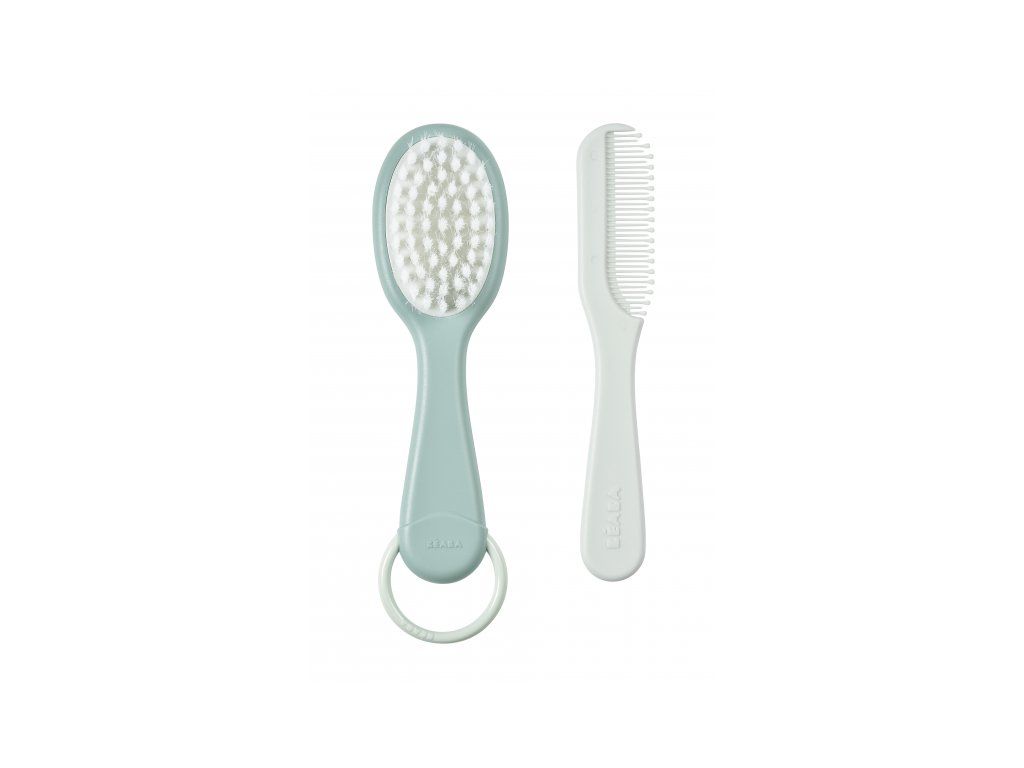 Souprava na péči o vlásky vašeho dítěte od narození obsahuje kartáč s měkkými štětinami a hřebínek se zaoblenými zuby. Ergonomický tvar kartáče i hřebínku usnadňuje rodiči uchopení.