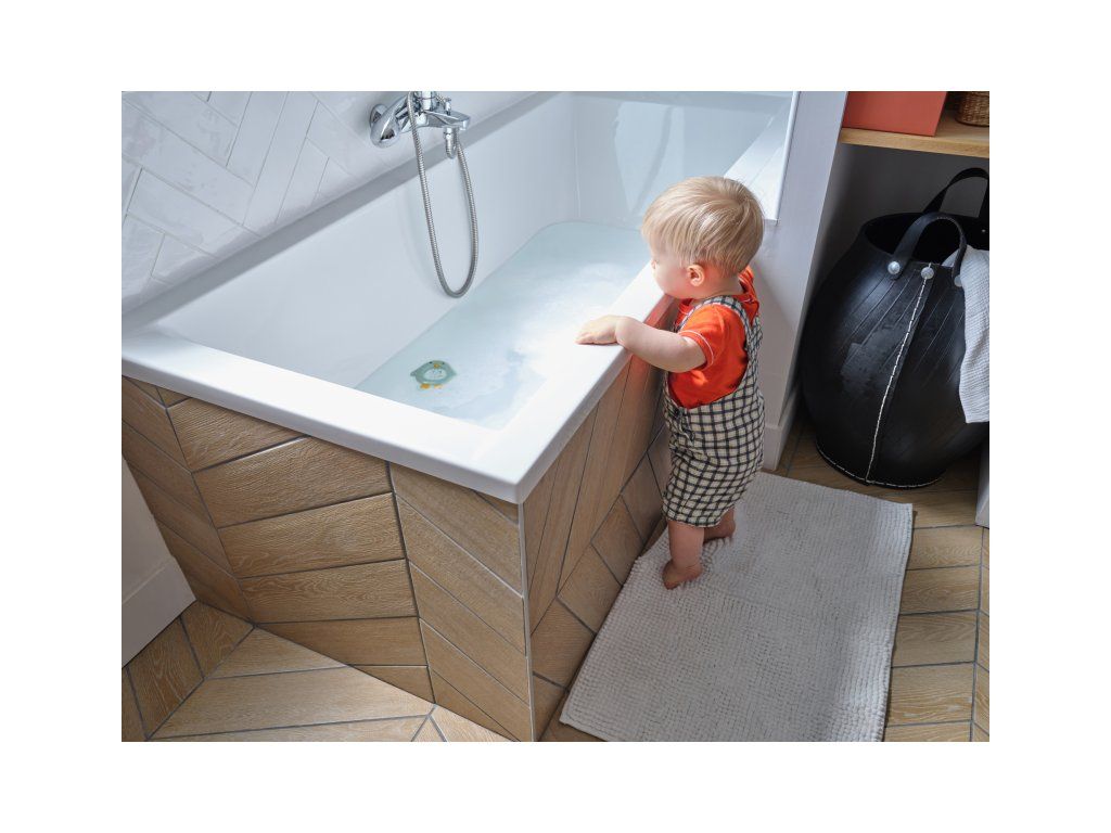 Teploměr pro kontrolu teploty vody v dětském koupeli plave na hladině pro snadné čtení naměřené teploty.