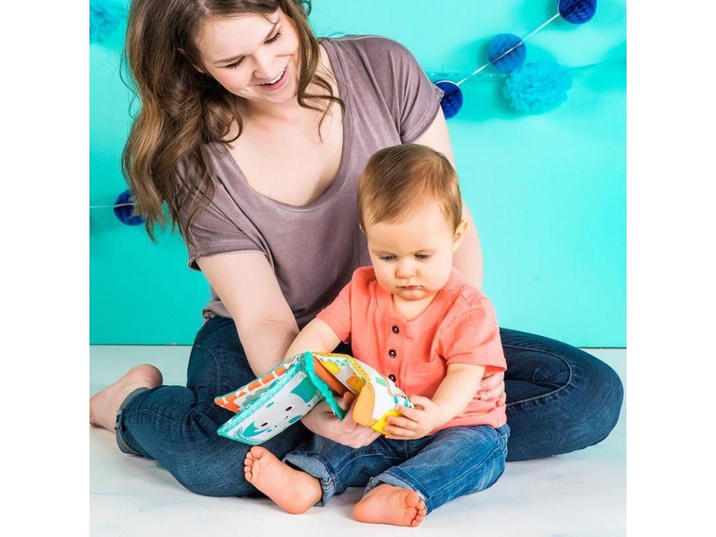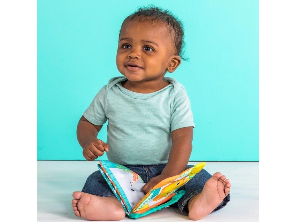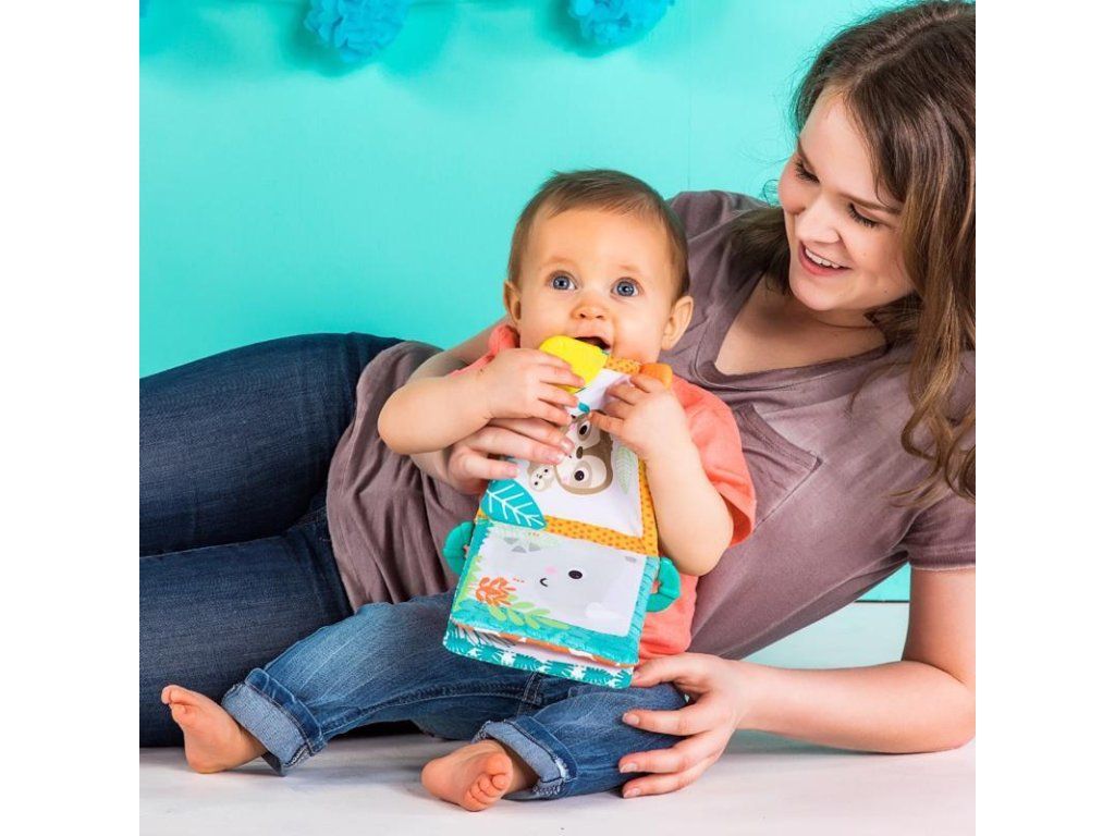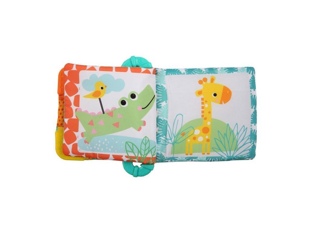 Textilní knížka je vhodná od 3 měsíců. Na stránkách plných dobrodružství jsou barevné obrázky a vzory, které stimulují zrak. Šustící stránky a různé druhy materiálů lákají děťátko ke zkoumání. Knížka má na levé straně zvlněnou kousátko-držák, na které jsou dva kroužky, které po zatřesení chřestí, zároveň pomáhají při prořezávání zoubků uklidnit dásně.