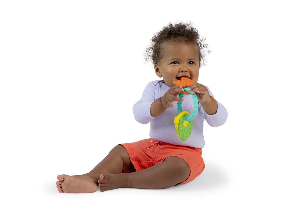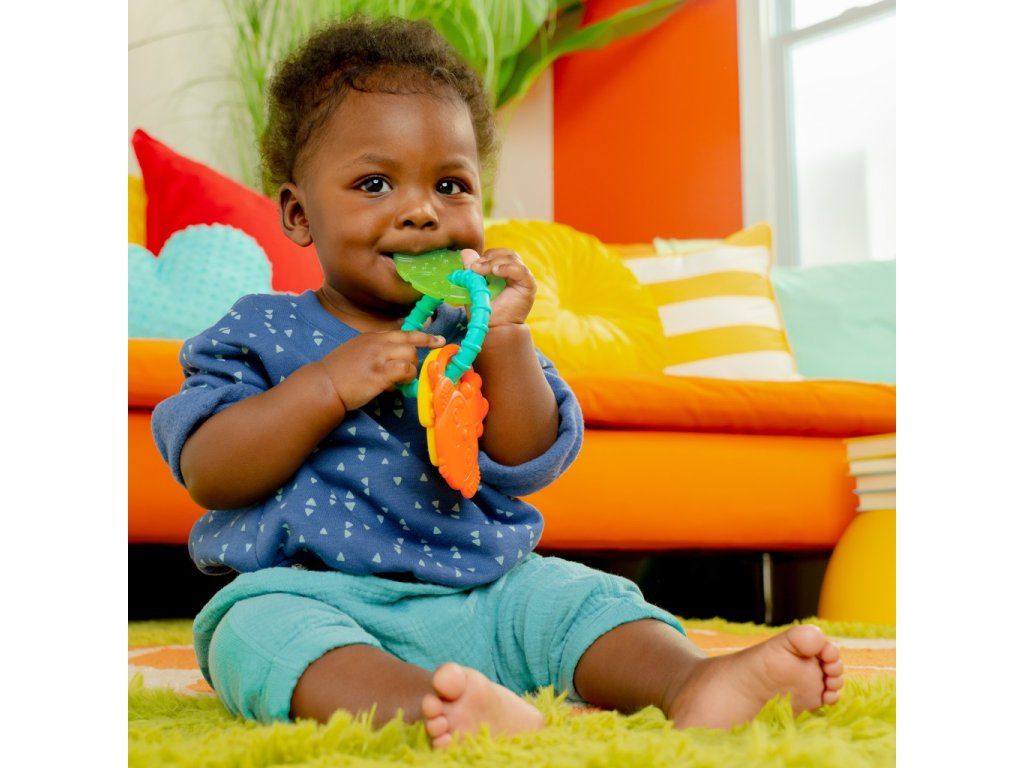 Vaše dítě si tento kousátko zamiluje. Rozlučte se s celodenním rozčilováním s tímto kousátkem 4 v 1, které je navrženo tak, aby pomáhalo uklidnit bolavé dásně a stimulovalo dítě při prořezávání zoubků. Dítě si zamiluje pestré barvy . Velikost je přizpůsobena malým ručičkám. Každý malý hřebínek a hrbolek pomůže masírovat bolavé dásně dítěte.