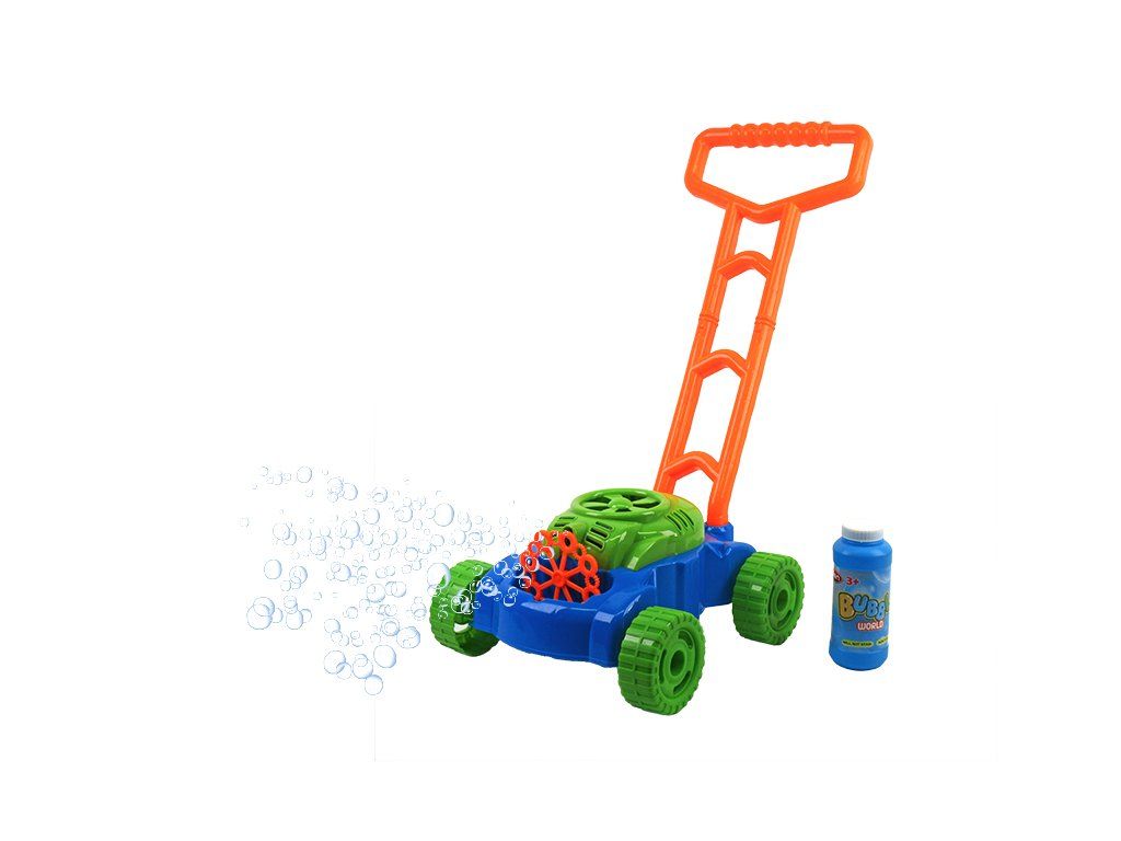 Místo klasického žacího ústrojí má tato sekačka speciální mechanismus na výrobu bublin. Ze sekačky se při jízdě valí nepřetržitý proud bublin.