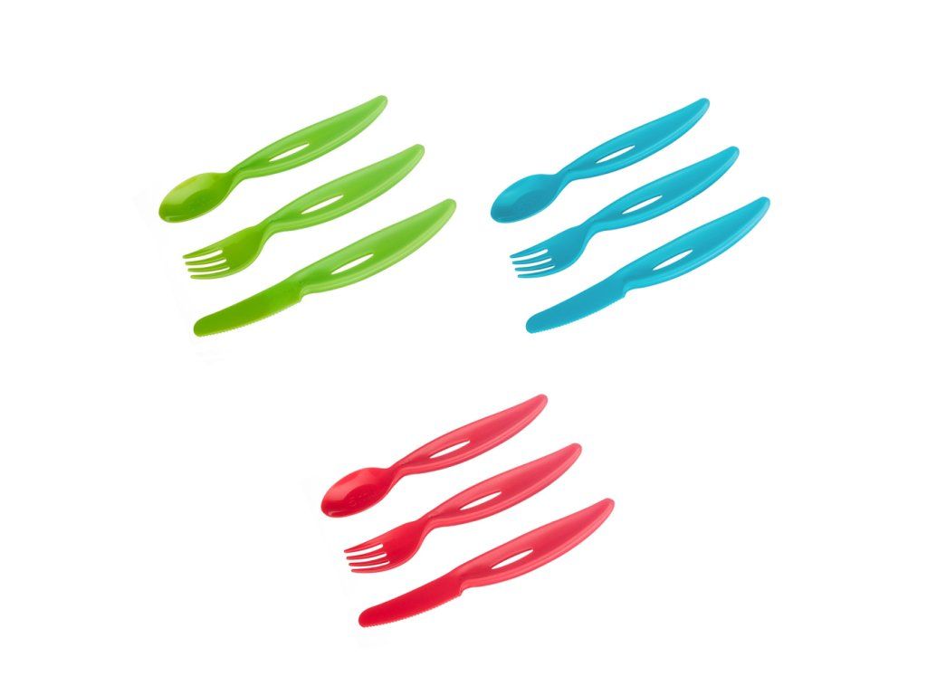 Plastové příbory jsou ideální pro učení samostatného jedení. Má pohodlné široké rukojeti, které usnadňují držení. Lžíce má odměrku, takže ji lze použít k podávání léků. Nůž s jemnými zoubky umožňuje naučit dítě krájet si samo. Sada se doporučuje pro děti starší 12 měsíců.