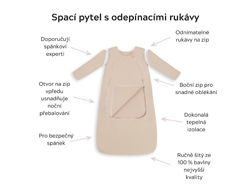 Víme, jak je spánek důležitý jak pro dítě, tak pro rodiče. Zajistit vám i vašemu děťátku dlouhý a bezpečný spánek je naším posláním. S obrovskou hrdostí a radostí vám proto představujeme produkt, na kterém jsme pracovali velmi dlouho tak, aby byl dokonale funkční a praktický. Jako odborníci na výrobu spacích pytlů jsme pro vás vytvořili celoroční spací pytel s odepínatelnými rukávy!