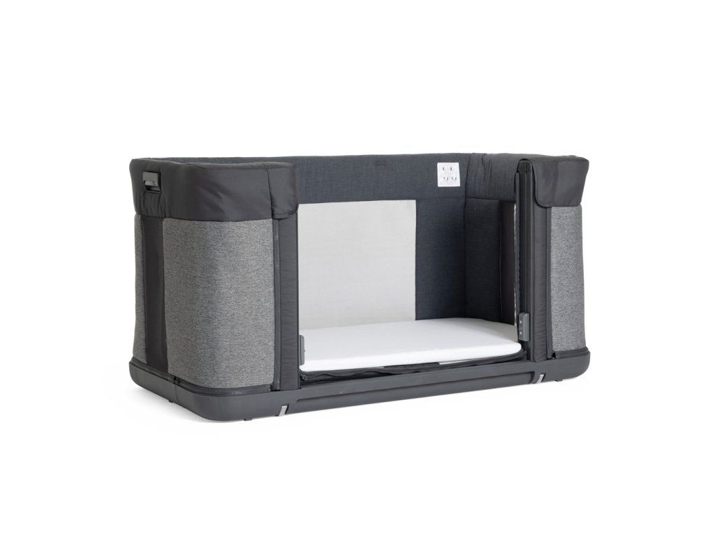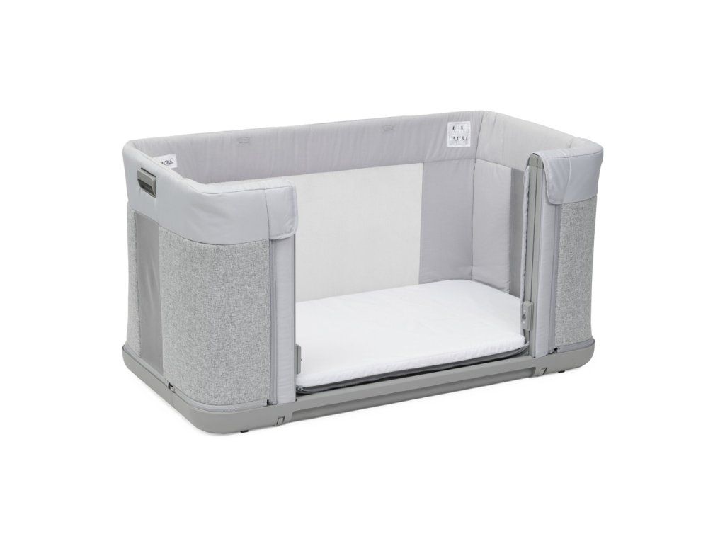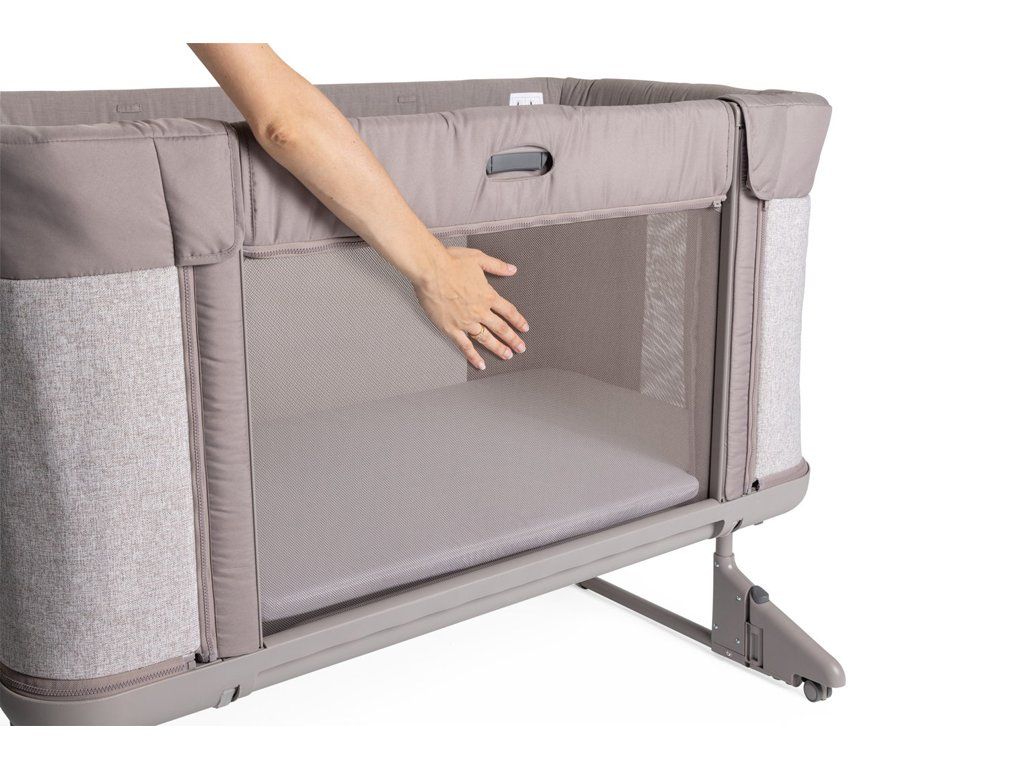 - Patentovaný systém zabraňuje tomu, aby boční strana zůstala spuštěná, když není dětská postýlka zcela připevněna k rodičovské posteli