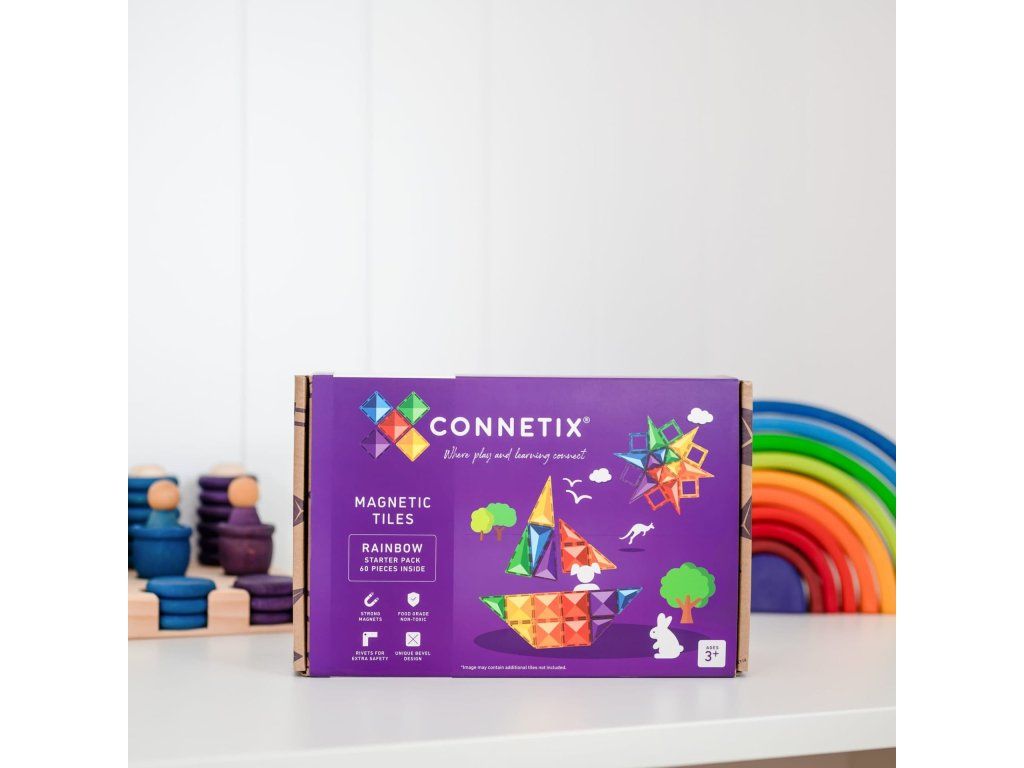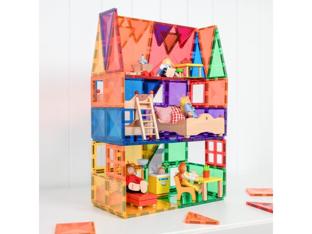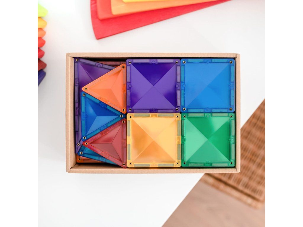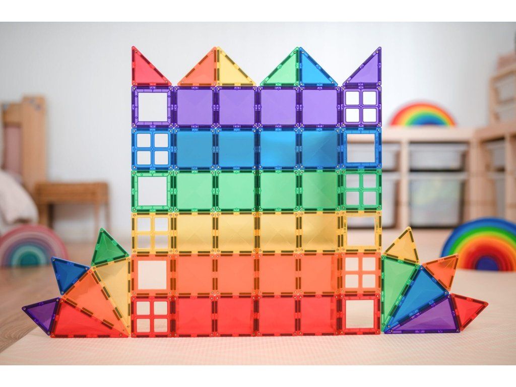 Sada obsahuje 6 velkých čtverců, 24 malých čtverců, 6 pravoúhlých čtverců, 6 rovnostranných čtverců, 6 rovnoramenných čtverců, 6 oken, 6 dveří a 1 brožuru s pokyny a šablonami. Tento balíček je ideální pro začátek vaší sbírky Connetix.