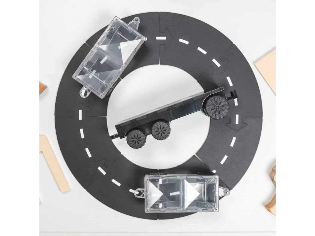 Sada obsahuje 1 nákladní auto, 2 základní auta, 3 rovnostranné trojúhelníky, 3 pravoúhlé trojúhelníky, 2 rovnoramenné trojúhelníky, 15 dílů dveří, 4 malé čtvercové kousky, 2 díly oken, 18 obdélníků a 1 knihu nápadů.