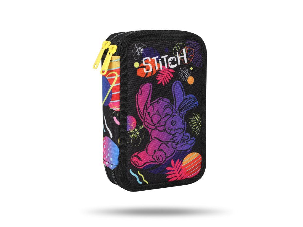 Penál Jumper dvoupodlažní Stitch Black Vše potřebné na psaní a tvoření v jednom praktickém penálu Penál Jumper Stitch Black je dvoupodlažní organizér pro děti, který obsahuje vše potřebné na psaní a kreslení. Díky odolnému zipu s kontrastním lemováním je ideální pro školáky. Gumičky na psací potřeby zajišťují pevnost a pořádek, zatímco vybavení jako fixy, pastelky a tužky zajistí vše, co děti potřebují pro tvořivé činnosti.Obsah:18× fixů12× pastelek1× trojhranná tužka HB 1× gelové pero 0,7 mm1× pravítko 15 cm1× guma1× ořezávátko