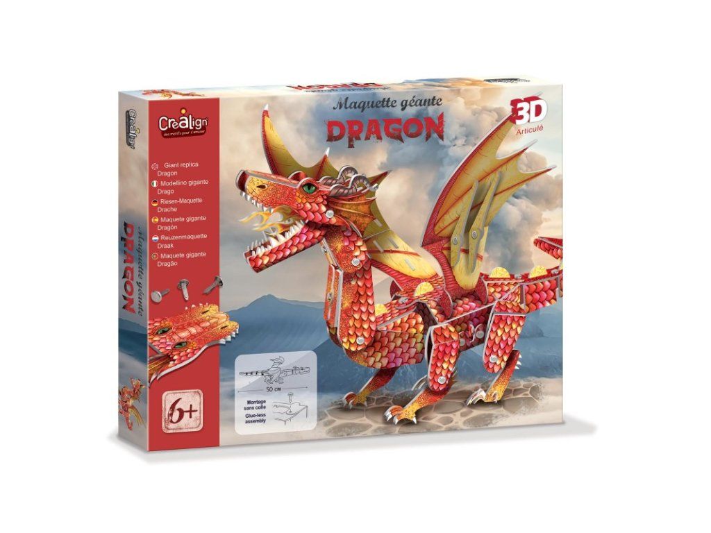 3D model Drak 6+ Vytvoř si obrovského draka! Jedinečná kreativní souprava od francouzské značky Crea Lign umožní dětem sestavit si 50 cm dlouhý model draka! Děti si nejprve vyloupnou kusy modelu, ohýbají je a následně spojí přiloženými kovovými šroubky podle návodu, a to zcela bez lepidla. Po dokončení si draka vystaví jako dekoraci nebo ho použijí jako kulisu pro své hry.S Crea Lign se děti učí nové techniky Stavěním 3D modelu draka si děti rozvíjí jemnou motoriku, logické myšlení i prostorovou představivost. Kreativní souprava pro děti je kvalitní a bezpečná, jako všechny výrobky francouzské značky Crea Lign. Jejím cílem je vyvíjet kreativní potřeby a hry, které podporují rozvoj dětí a umožňují každému z nich najít to, co ho baví.