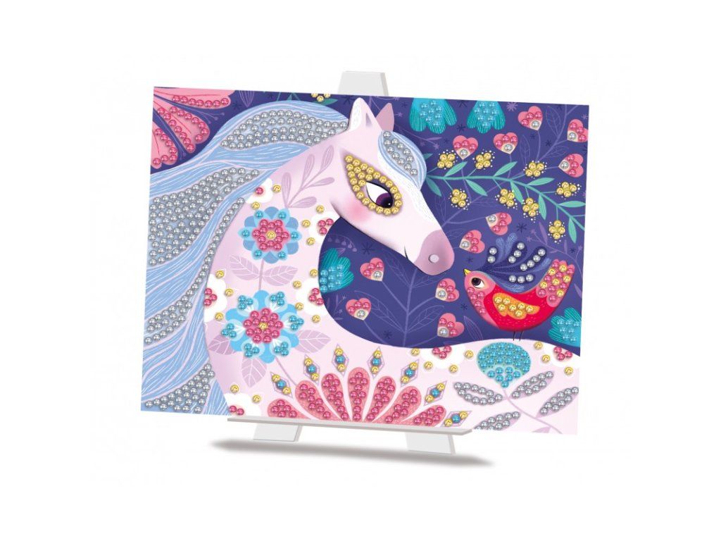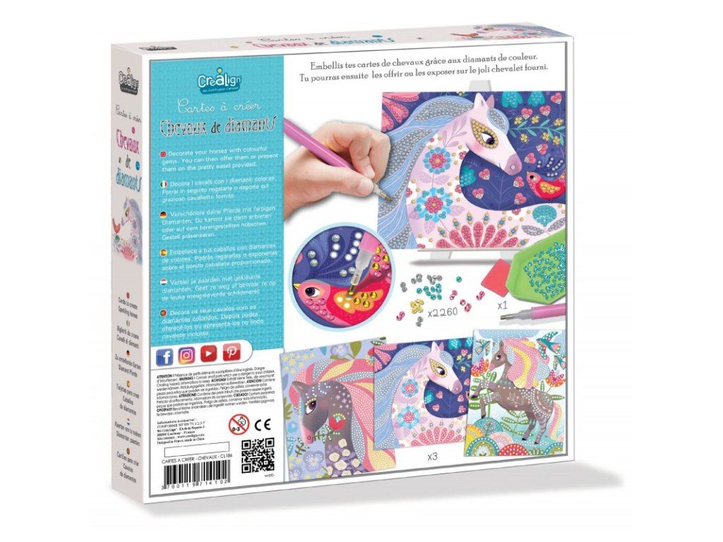 Diamantové mozaiky Koně 5+ Vytvoř si nádherné třpytivé koně! Jedinečná kreativní sada pro děti s nalepovacími kamínky od francouzské značky Crea Lign je vhodná pro děti od 5 let. Obsahuje 3 obrázky koní, 4 sáčky s malými třpytivými kamínky k nalepení a 1 pero. Díky nim si děti koně krásně dotvoří. V baleních nechybí ani 1 skládací stojan na vystavení mozaiky.S Crea Lign se děti učí nové umělecké techniky. Diamantové malování podporuje rozvoj jemné motoriky, představivosti i kreativity. Produkt je vysoce kvalitní a bezpečný, stejně jako všechny ostatní výrobky francouzské značky Crea Lign. Jejím cílem je vyvíjet kreativní potřeby a hry, které podporují rozvoj dětí a umožňují každému z nich najít to, co ho baví.