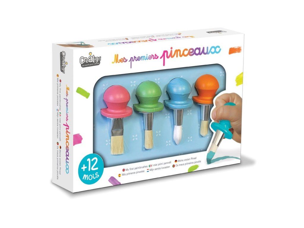 Moje první štětce 4 ks První štětce pro nejmenší děti Moje první štětce jsou ideální volbou pro nejmenší děti, které se seznamují s barvami. Sada obsahuje 4 štětce s ergonomickými, barevnými rukojeťmi, které jsou navrženy tak, aby se pohodlně vešly do malých dětských ručiček. Každý štětec má jiný tvar a velikost, od plochého štětce až po jemný špičatý štětec, což umožňuje různé styly malby a experimentování. Díky bezpečnému designu jsou štětce vhodné pro děti již od 12 měsíců. Nejlépe se používají s tekutou barvou na velkých listech papíru. Štětce pomáhají dětem rozvíjet jemnou motoriku, kreativitu a koordinaci ruka-oko.Balení obsahuje: 1x plochý štětec, 1x oválný štětec, 1x štětec s kulatým hrotem na šablonování, 1x špičatý štětec s jemnými štětinami.