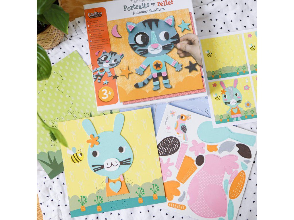Pěnové obrázky Domácí zvířátka 3+ Vytvoř si jednoduchou 3D mozaiku! Kreativní souprava pro děti Pěnové obrázky Domácí zvířátko od francouzské značky Crea Lign z řady Jednoduché obrázky je vhodná již pro děti od 3 let. Obsahuje 5 podkladových obrázků a 5 archů barevných pěnových samolepek. Díky nim si děti všechna zvířátka jednoduše dotvoří a vzniknou jim originální 3D obrázky Nechybí ani 1 stojan na následné vystavení uměleckého díla.S Crea Lign se děti učí nové umělecké techniky Tvoření s pěnovými samolepkami podporuje rozvoj jemné motoriky, představivosti i kreativity. Produkt je vysoce kvalitní a bezpečný, stejně jako všechny ostatní výrobky francouzské značky Crea Lign. Jejím cílem je vyvíjet kreativní potřeby a hry, které podporují rozvoj dětí a umožňují každému z nich najít to, co ho baví.
