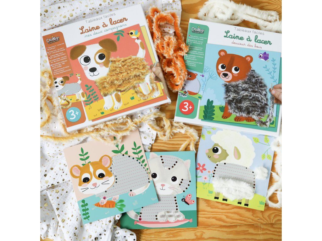 Navlékací obrázky Huňatá zvířátka 3+ Vytvoř si rozkošného domácího mazlíčka Kreativní sada pro děti Navlékací obrázky Huňatá zvířátka od francouzské značky Crea Lign z řady Jednoduché obrázky je vhodná již pro děti od 3 let. Obsahuje 5 podkladových obrázků zvířátek s dírkami na navlékání, které si děti jednoduše dotvoří 80 cm dlouhými, chlupatými provázky (3 ks). Balení také obsahuje návod, arch samolepek na zafixování provázků a skládací papírový stojan na vystavení hotového uměleckého díla.S Crea Lign se děti učí nové umělecké techniky Toto speciální umělecké provlékání pro děti podporuje rozvoj jemné motoriky, představivosti i kreativity. Produkt je vysoce kvalitní a bezpečný, stejně jako všechny ostatní výrobky francouzské značky Crea Lign. Jejím cílem je vyvíjet kreativní potřeby a hry, které podporují rozvoj dětí a umožňují každému z nich najít to, co ho baví.