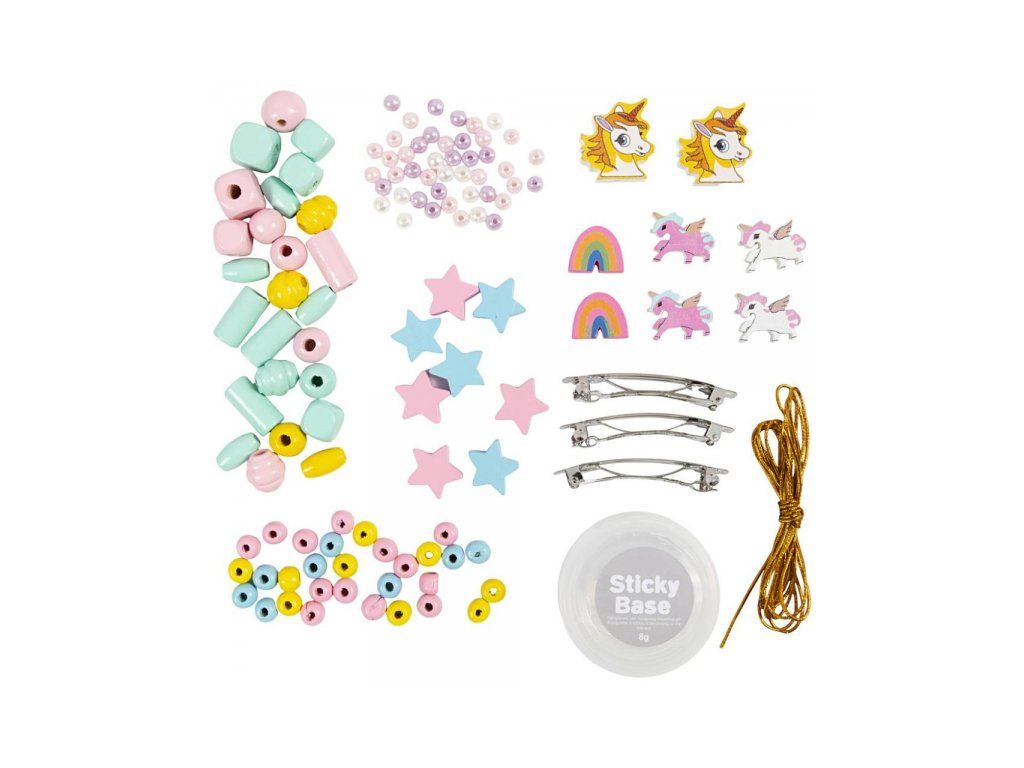 • Různé typy korálků: dřevěné, perleťové, tvarované (hvězdičky, duhy, jednorožci) – pro pestré kombinace