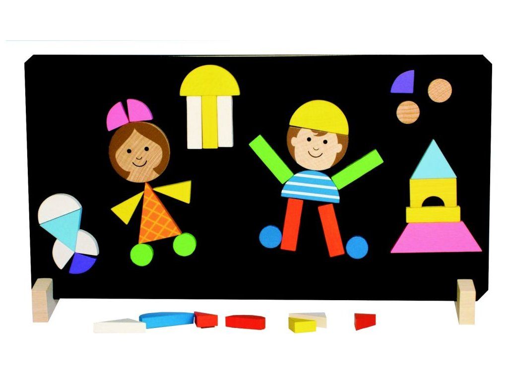 Obsah balení: Magnetická tabulka 310x165 mm, 2x dřevěný stojan a 37 dřevěných dílků.