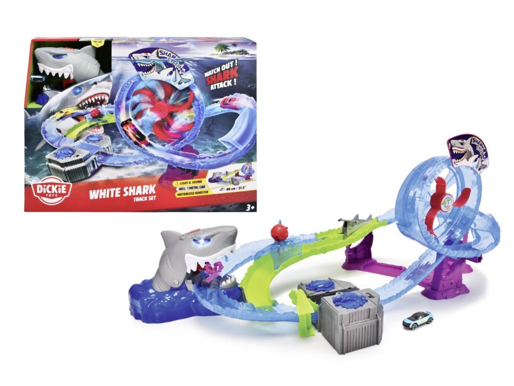 Autodráha White Shark s délkou 80 cm. Motorizovaná dráha se žralokem a smyčkou. Světelná i zvuková funkce – hrozivé podvodní zvuky, světelné efekty a řev žraloka. Auta se plnou rychlostí řítí smyčkou, projíždějí vodním tunelem nebo přistávají přímo u velkého bílého žraloka – ale pozor, může kdykoli skousnout čelistmi. Turbo booster přivádí vozidla na nejvyšší rychlost. Součástí je kovové autíčko. Rozměry autodráhy: 50 x 55 x 32 cm.