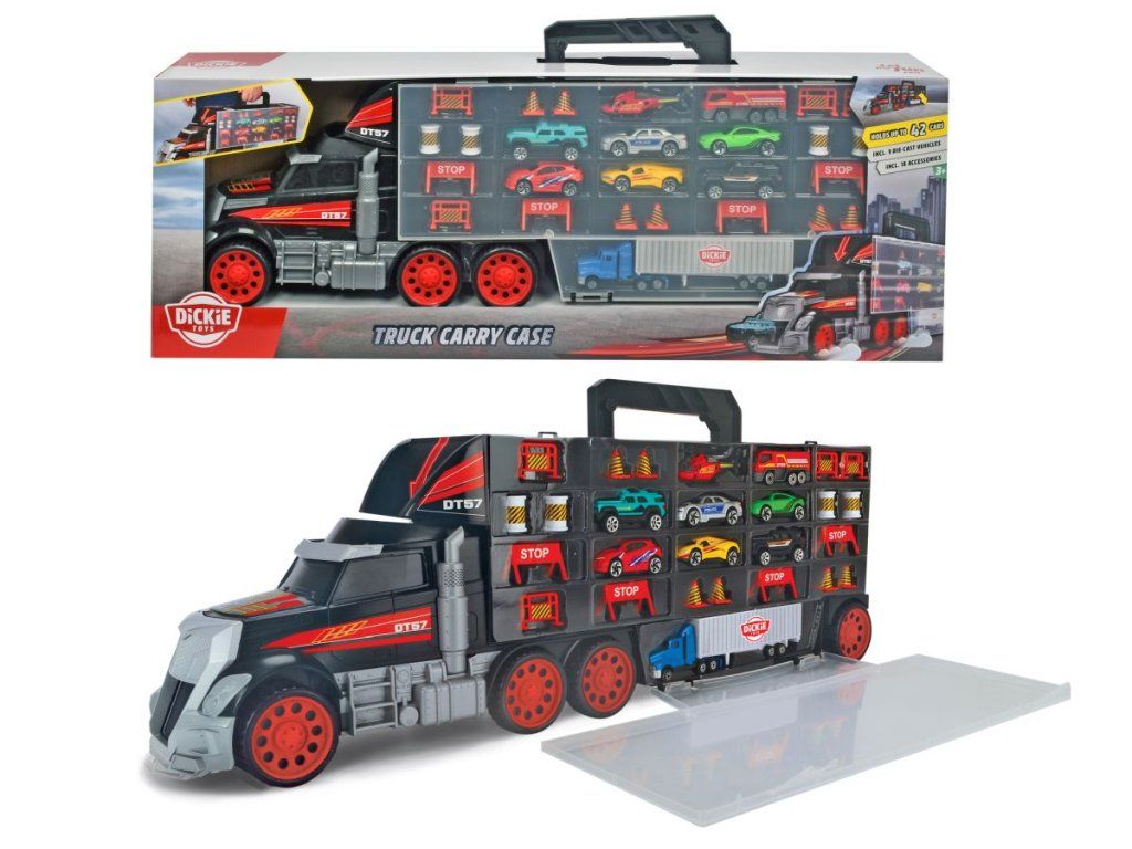 Velká souprava s příslušenstvím ve tvaru kamionu, s rukojetí. Včetně 7 kovových autíček, nákladního auta a vrtulníku. S manuální funkcí vystřelování z kabiny kamionu. Délka 62 cm.