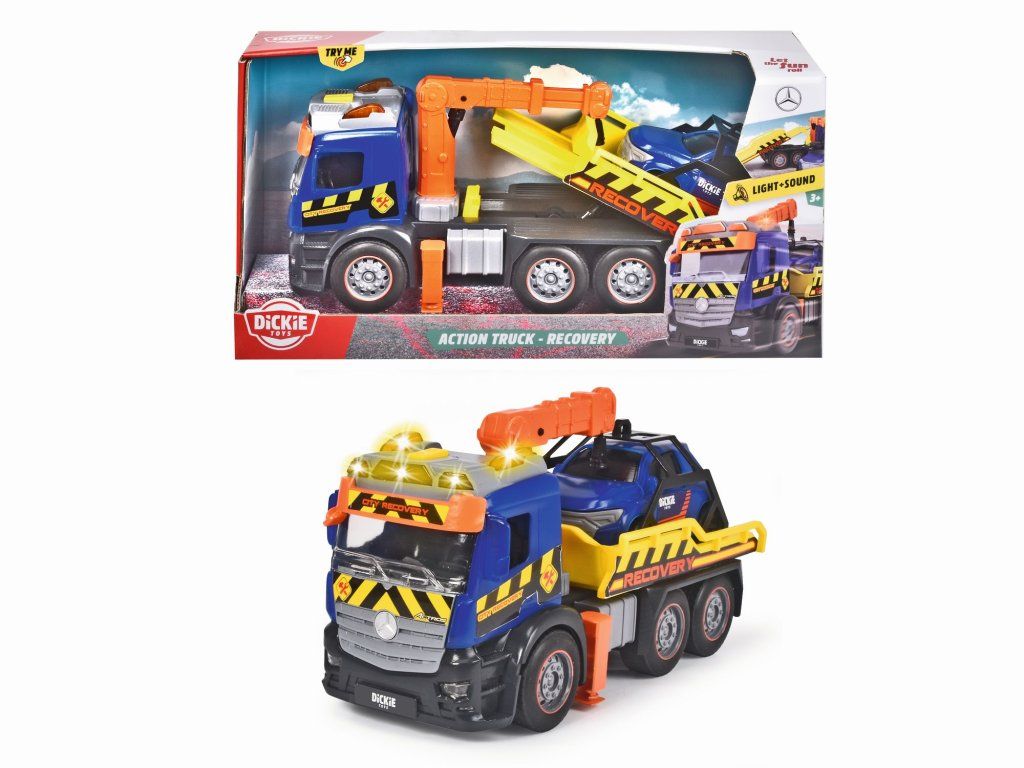 Odtahový vůz Mercedes na setrvačník se světelnými a zvukovými efekty a pohyblivými díly, délka 26 cm. Součástí je osobní auto na volnoběh, 12 cm.