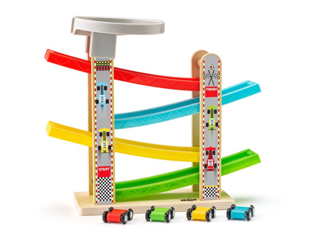 Hračka pro nejmenší. Dítě umístí autíčka na horní plochu dráhy, nakloní ji a autíčka sjedou po dráze dolů. Rozvoj jemné motoriky a koordinace oko-ruka. | Rozměr: 31 x 10 x 27 cm | Věk: 18m+