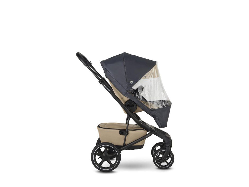 Transparentní pláštěnka chrání dítě před deštěm a větrem.