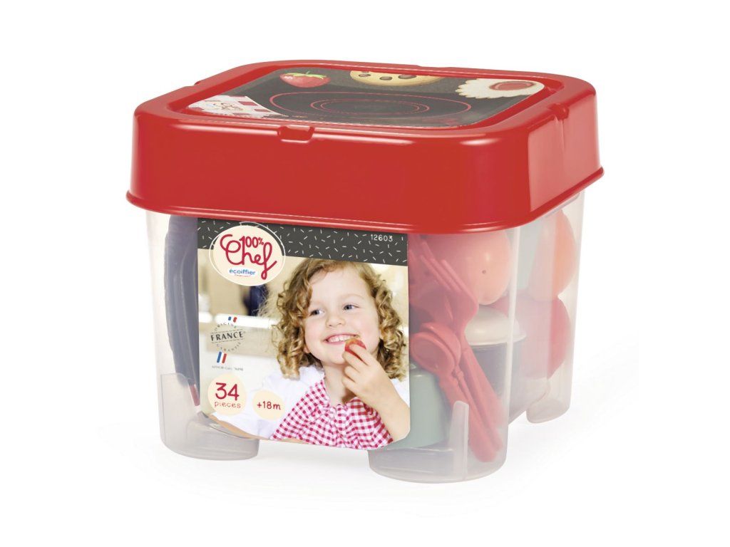 Jídelní souprava obsahuje vše potřebné k přípravě pohoštění, vč. nádobí. 4 talíře, sada příborů, skleničky, hrnky, konvička s víčkem, hrnec s pokličkou, ovoce a další.