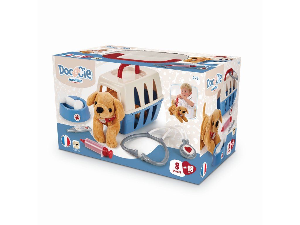 Kufřík pro malého veterináře s příslušenstvím a pejskem. Kufřík je možné použít jako přepravní box pro pejska a také na uskladnění příslušenství. Součástí je miska pro pejska, kost, lékařské vybavení (teploměr, stříkačka, stetoskop). Rozměry kufříku: 24 x 15 x 14 cm.