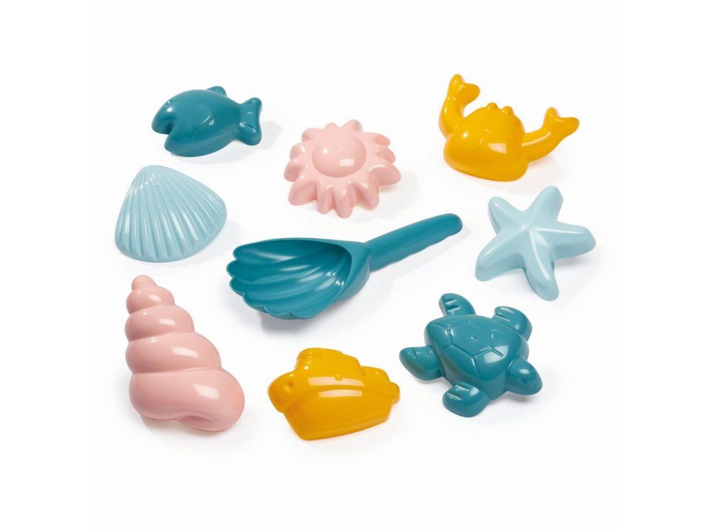 Sada 8 formiček s mořskou tématikou (želva, mušle, ryba, hvězdice) na písek a lopatka ve tvaru mušle.