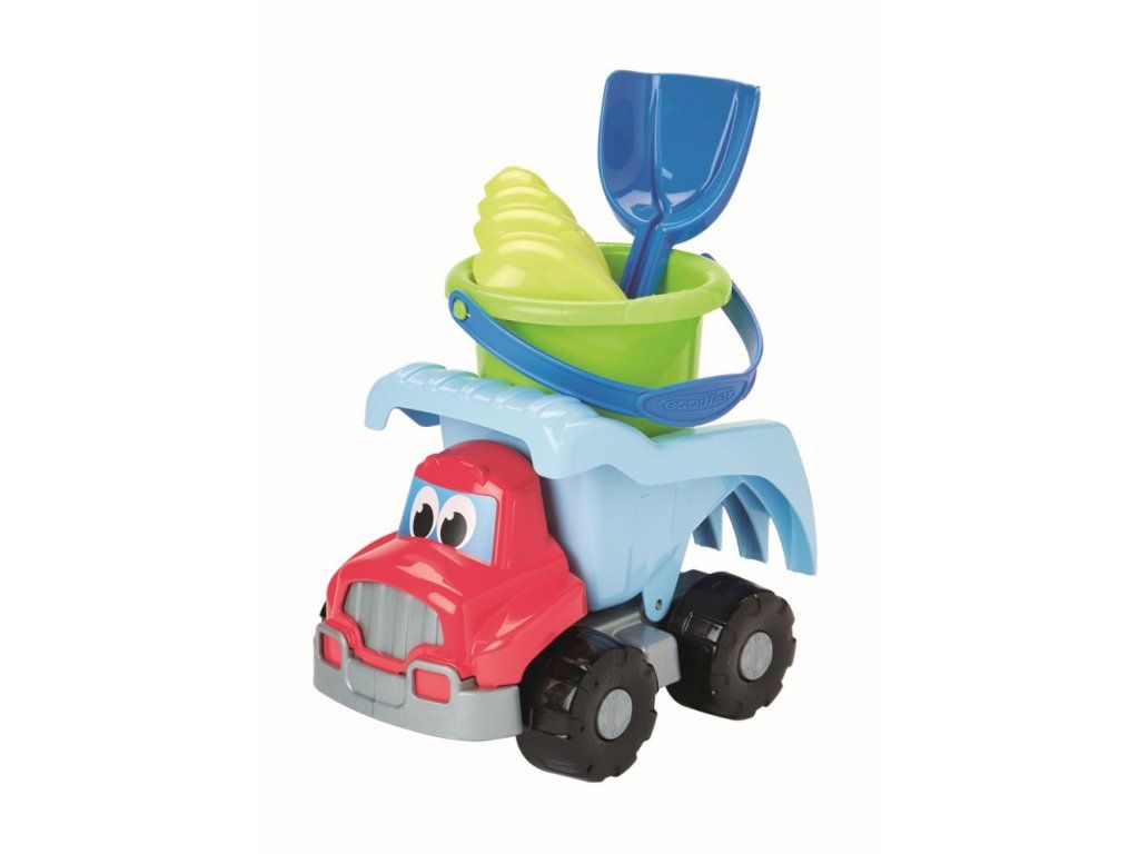 Veselé nákladní autíčko - sklápěčka na písek. Součástí je kyblík, lopatka a formička. Rozměry: 20 x 14,5 x 18 cm.
