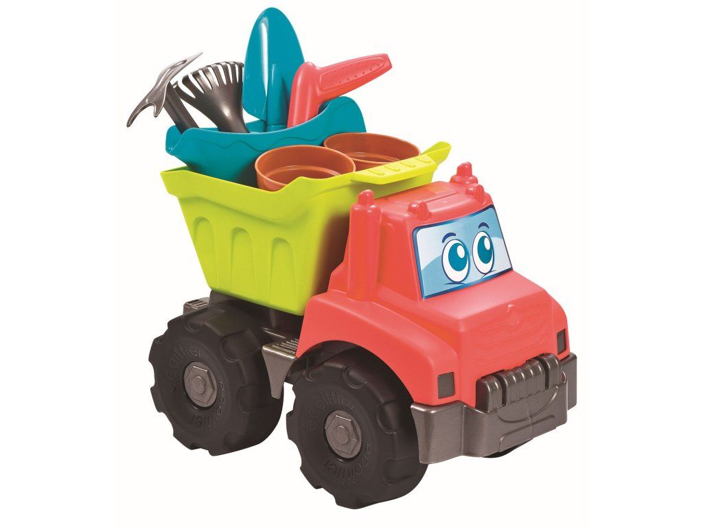 Sklápěč s humornýma očima na zahradu nebo na písek. Součástí konvička, dva květináče, lopata, hrábě, rýč a sázecí kolík. Rozměry (DxŠxV): 32,5 x 20 x 25 cm.