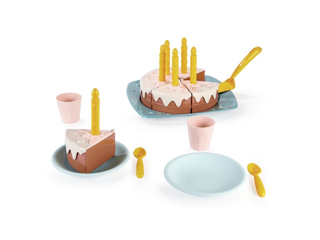 Sada Narozeninový dort a další příslušenství. Obsahuje dort, který lze rozdělit na 6 dílků, 6 svíček, podnos na dort, dva talíře, dvě lžíce a dva šálky. Celkem sada obsahuje 20 kusů doplňků. Vyrobeno z plastu s snadnou údržbou, bez ostrých hran a rohů. Ideální také jako doplněk do kuchyňky nebo obchodu s potravinami.