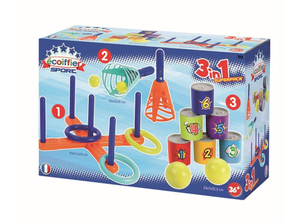 Sada 3 oblíbených her vhodných do interiéru i exteriéru - chyť míček, kroužky na kříž a shazování plechovek. Vše je plastové, vyrobeno ve Francii.