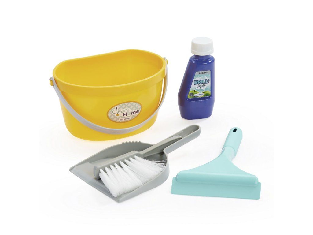 Sada na úklid obsahuje kyblík, metličku a lopatku, stěrku na sklo a maketu čisticího prostředku.
