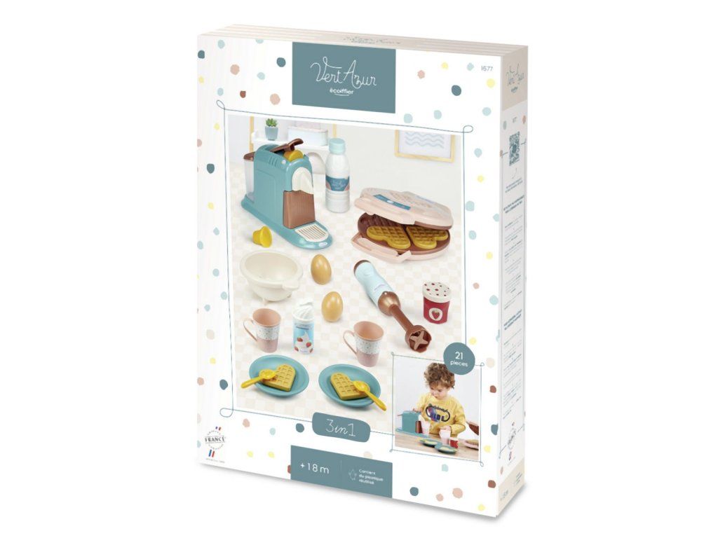 Sada 3 v 1 na přípravu snídaně obsahuje 3 spotřebiče – kávovar, vaflovač a tyčový mixér. Součástí sady jsou doplňky: 4 vafle, miska, 2 vejce, 2 kapsle do kávovaru, 2 šálky, láhev mléka, plechovka šlehačky a sklenice džemu. Rozměry výrobku: 22,5 x 17 x 14 cm.