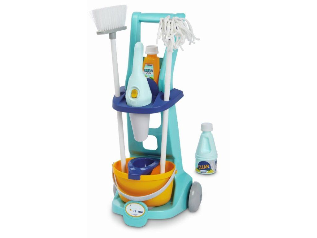 Vozík obsahuje veškeré potřebné nářadí: kbelík na úklid, mop, smeták, úklidové potřeby a ruční vysavač. Vozík pro domácnost je obzvláště lehký a ovladatelný, a proto jej lze vzít kamkoli. Tento úklidový vozík bohatý na detaily a bez ostrých hran je vhodný již pro děti od 3 let. Rozměry produktu (D׊×V): 21 × 26,5 × 56 cm.
