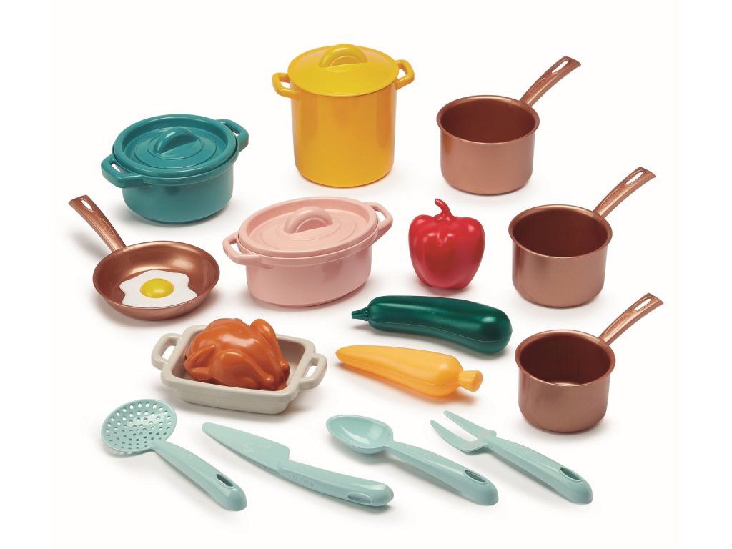 Velká sada nádobí, potravin a hotových pokrmů. Krabice zároveň slouží jako sporák. Celkem obsahuje 20 ks.