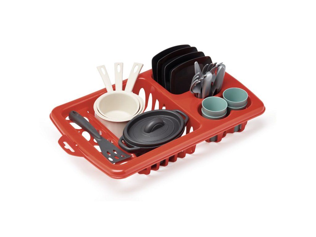 Velká sada nádobí s odkapávačem obsahuje, hrnky, příbory, talíře, hrnec s poklicí, sadu rendlíků a obracečku. Rozměry odkapávače 33,5 x 10 x 21 cm.