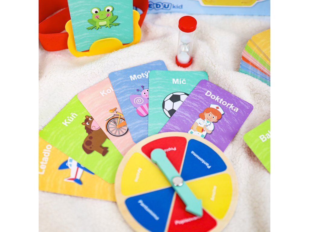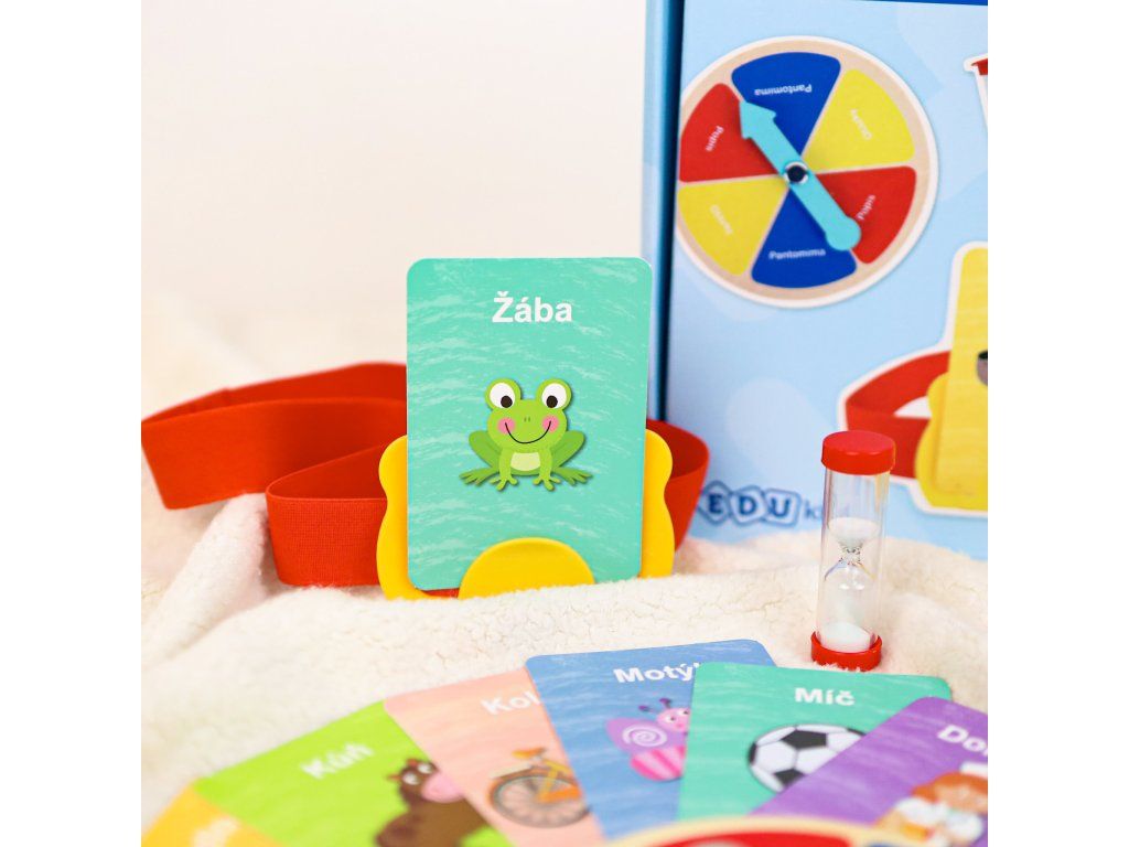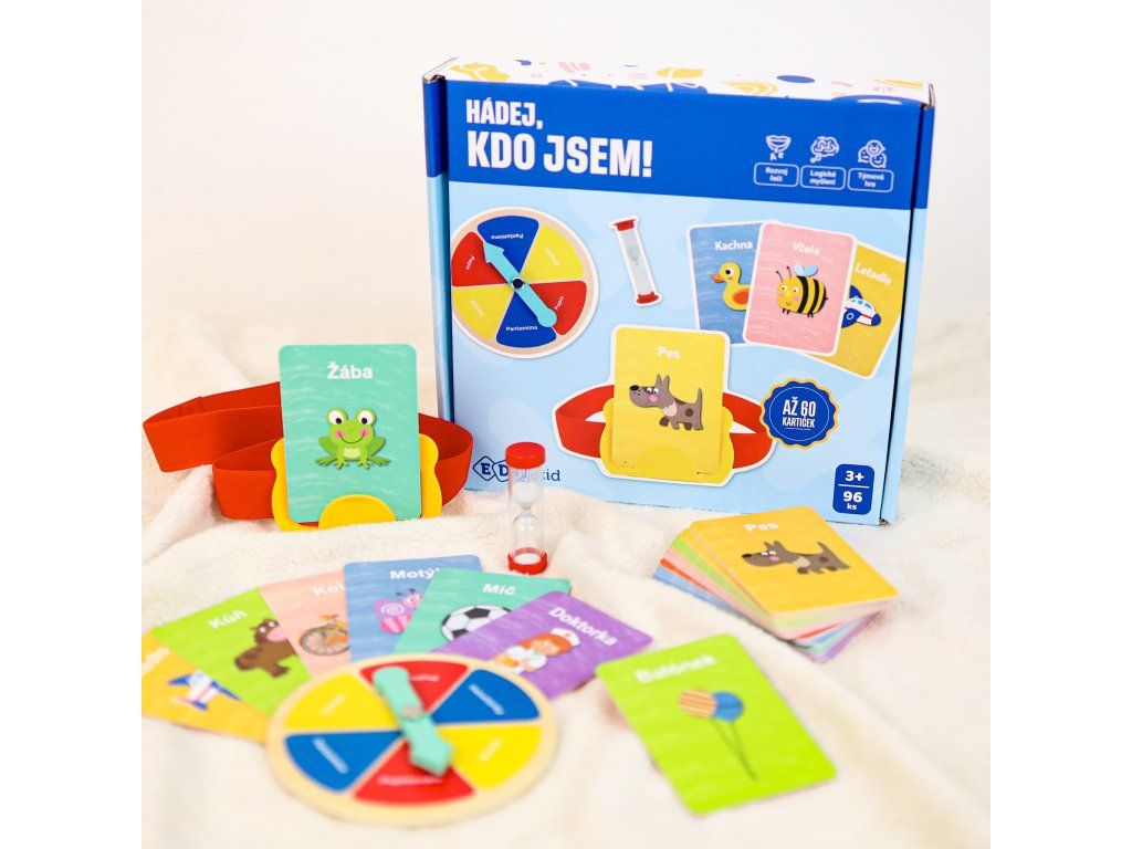 Hádej, kdo jsem! Oblíbená hra pro celou rodinu Hádej, kdo jsem! je zábavná rodinná hra, která přináší hodně smíchu a rozvíjí dětské schopnosti. V této hře se jeden hráč postaví do role hádajícího a ostatní hráči mu ukazují, co se skrývá na jeho čele, a to buď pantomimou, otázkami, nebo popisováním. Hráč se pokouší uhádnout, co na jeho čele je – může to být letadlo, žabka, kachna či kravička. Hra má až 60 karet, které nabízejí množství různých zvířátek a předmětů k hádání.Rodinná hra, kde je důležitý čas, otázky a správné tipy Součástí balení jsou i přesýpací hodiny a bodovací hvězdičky, které vám umožní hrát různé verze, od jednoduché po složitější. Hádej, kdo jsem! je skvělá hra pro rozvoj dětské slovní zásoby, řečových schopností a interakce s ostatními. Děti se učí klást otázky, komunikovat a také efektivně spolupracovat s ostatními hráči. Vše je vyrobeno z kvalitních materiálů s důrazem na životní prostředí a bezpečnost. Upozornění! Hra je v českém jazyce.
